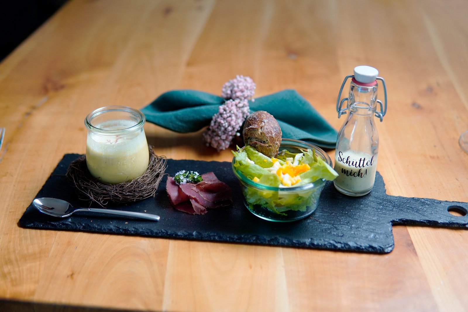 Eine Schieferlatte oder Vorspeiseteller bereitstellen. Süppchen in Gläsli abfüllen, mit Rahmtupfer, Safranfäden und Petersilie dekorieren. Blattsalat in Schüsseli abfüllen, mit Eischeiben und Blütenblättern ausgarnieren. Brötli mit einem Brotmesser einschneiden und auf Schüsselirand aufstecken, Salatsauce in kleine Fläschchen abfüllen und dazustellen. Trockenfleisch dazu legen.