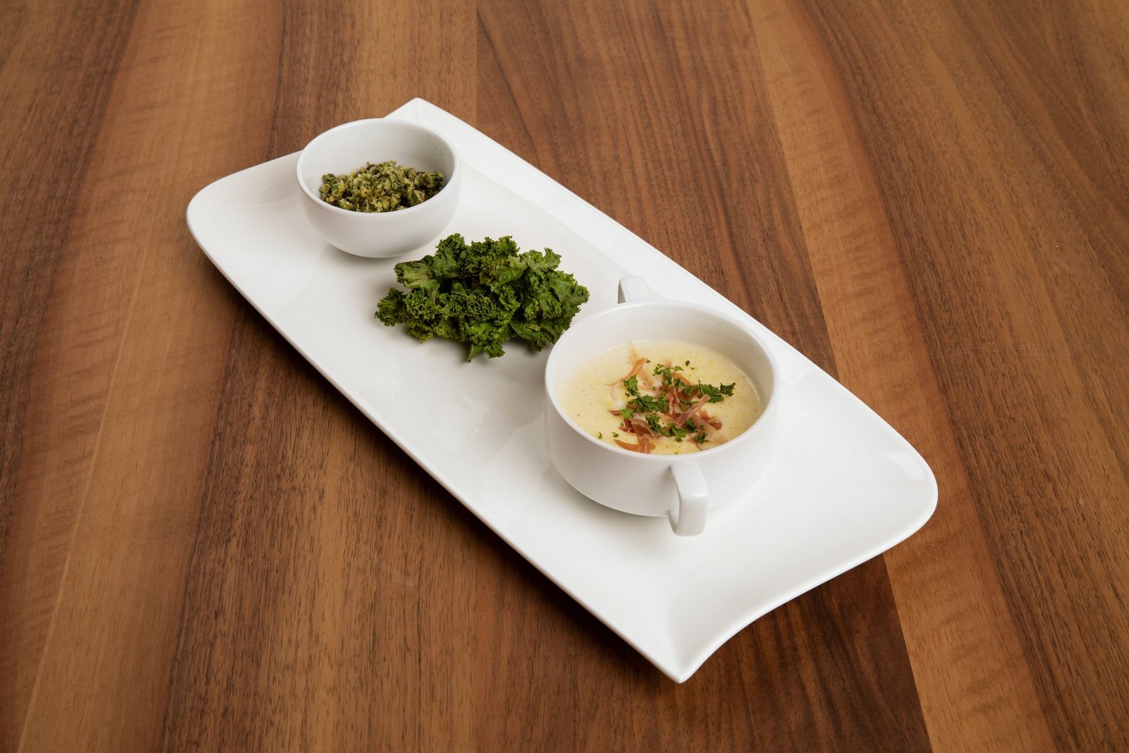 Maissuppe in vorgewärmten Suppentassen anrichten. Mit gebratenen Schinkenspeckstreifen und Schnittlauch dekorieren. Kräuterstreusel und Federkohlchips dazu anrichten.