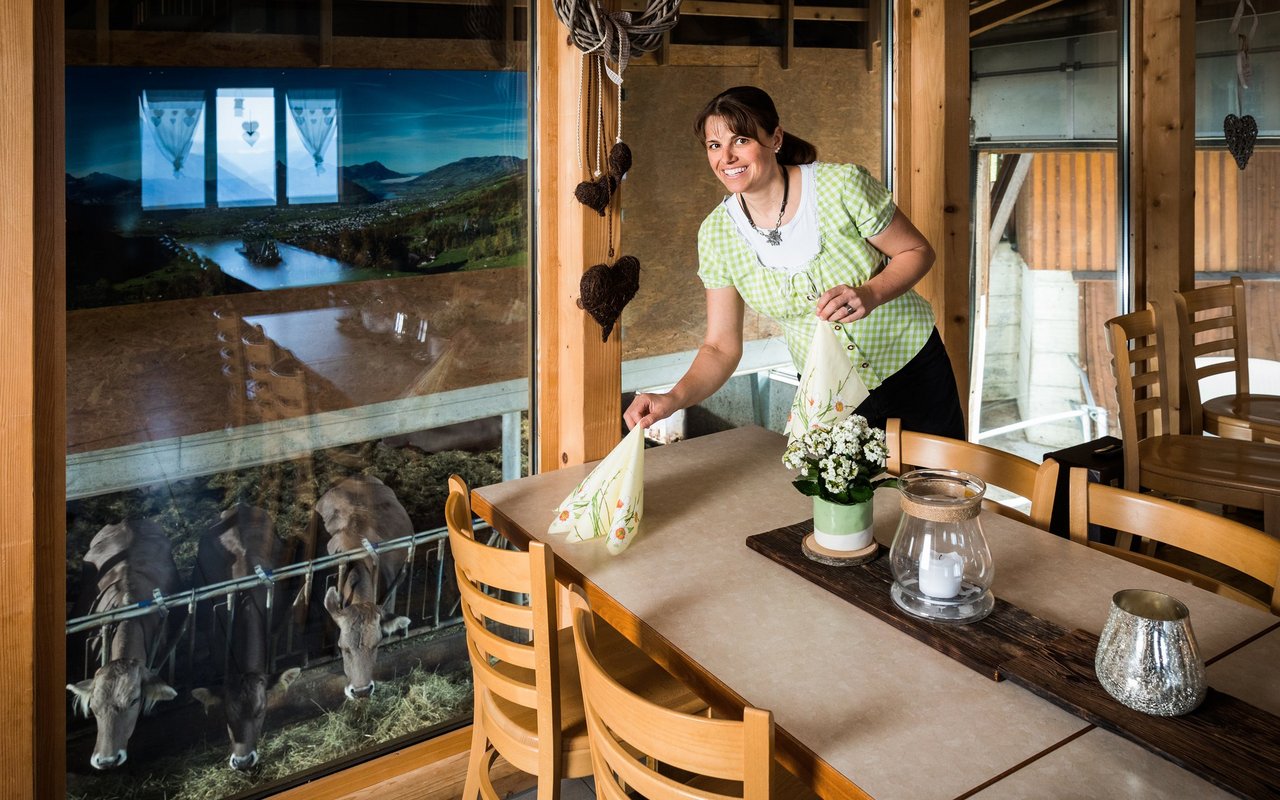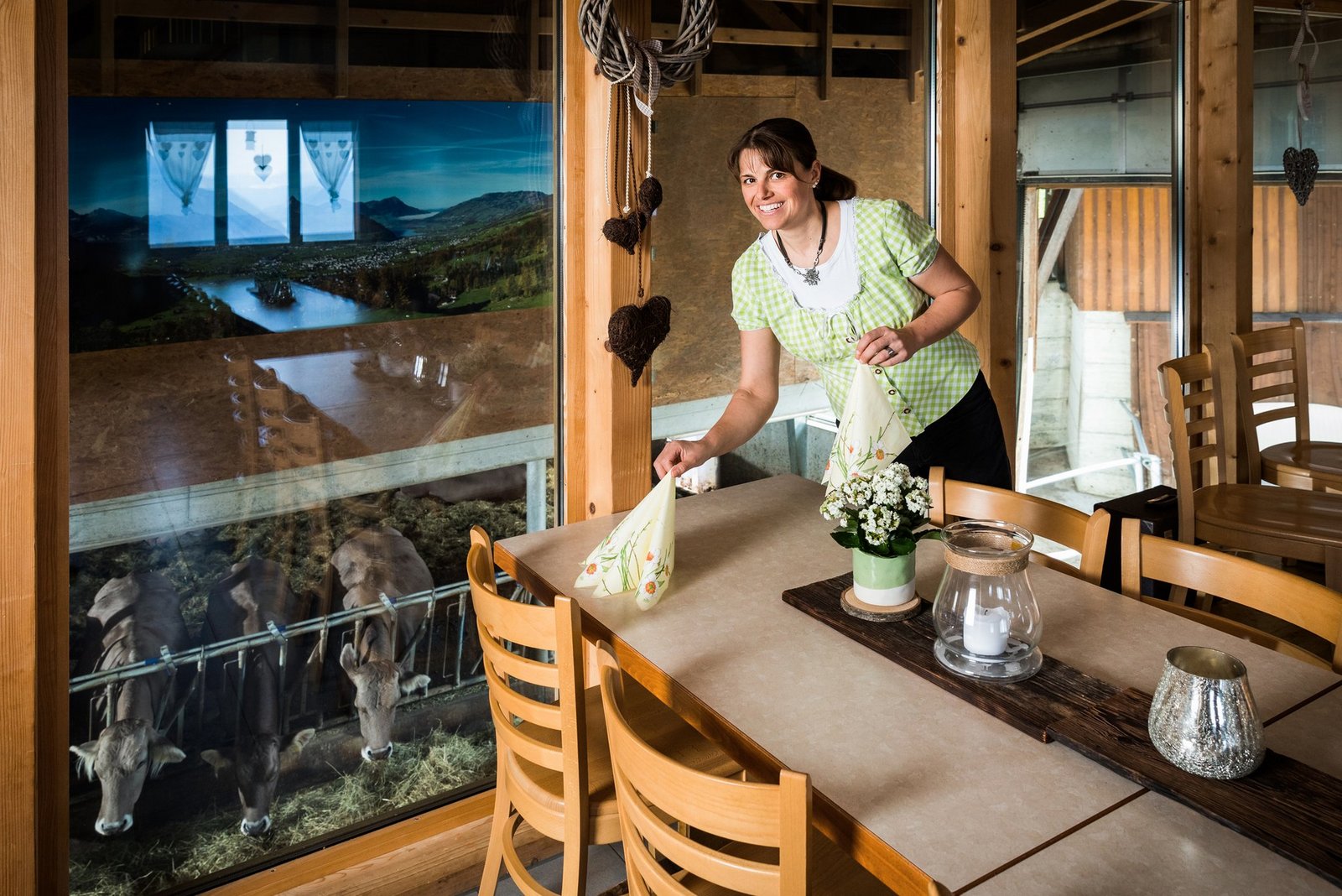 Doch für Eliane Schürpf war es eine ideale Vorbereitung auf ihr heutiges Leben. Den im Huserenberg ist sie für die «Besenbeiz» verantwortlich, die neben der Milchwirtschaft ein wichtiger Betriebszweig ist. Wobei der Name «Besenbeiz» irreführend ist: Im hellen Lokal können sich bis zu 100 Personen verpflegen. Einmalig ist die Aussicht durch eine Glasscheibe direkt in den Stall und auf die Kühe ein Stockwerk tiefer - und auf das grosse Foto mit der Rundsicht.
