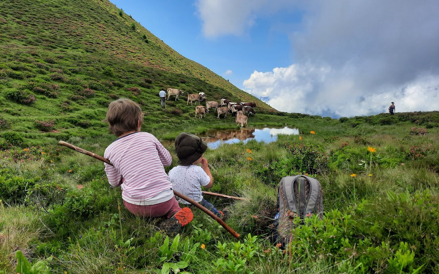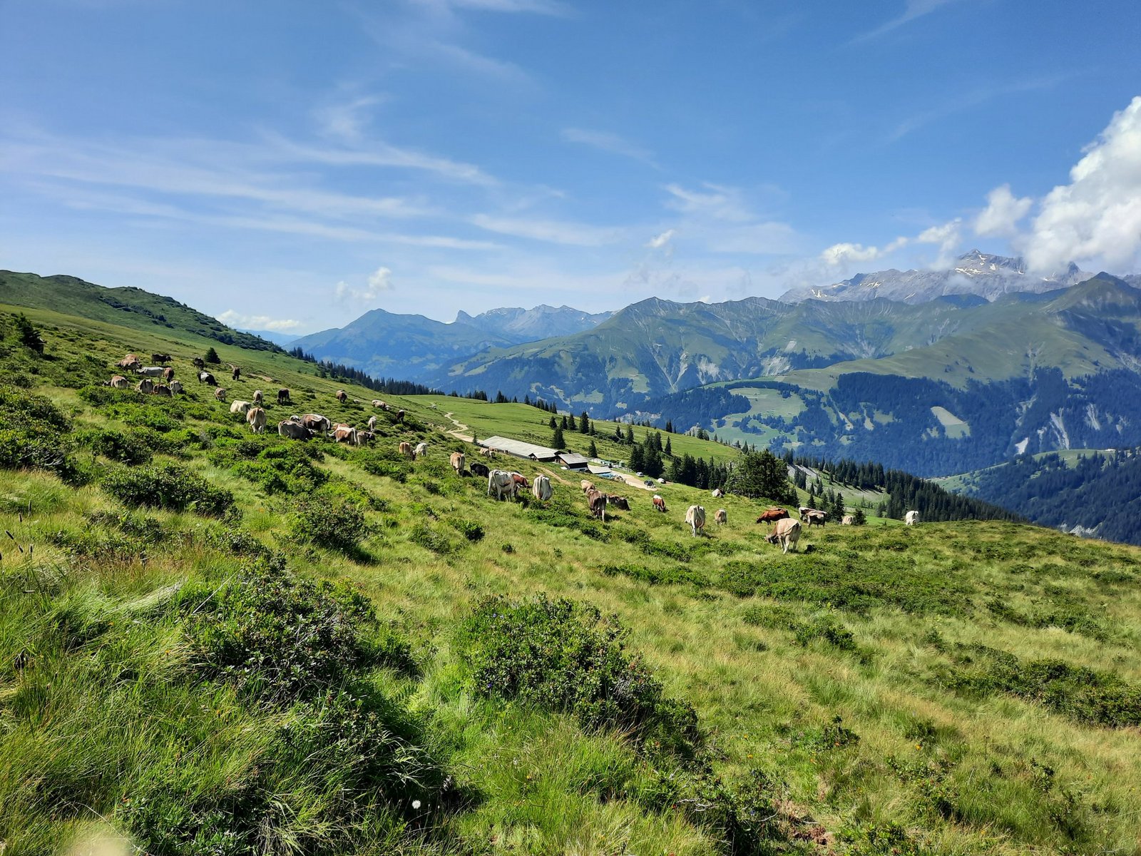 Endlich richtig Sommer! Blicken wir ins Tal, sehen wir, wie überall fleissig gemäht wird. Mit unseren Kühen sind wir nun auf den obersten Weiden vom «Chrüz» auf 2195 Meter über Meer. Damit sie nicht bei zu heissem Wetter die 300 Höhenmeter erklimmen müssen, beginnt unser Hirtenteam bereits morgens um halb drei mit Einstallen. Zu zweit werden nach dem Melken die Kühe auf die saftigen Weiden getrieben. [IMG 2] Nachmi…