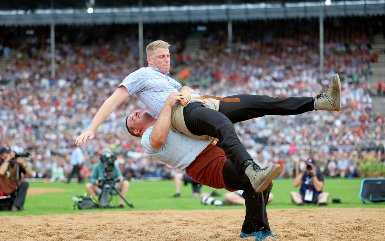 Im Anschwingen bekamen es nun Schneider und Ledermann miteinander zu tun. Der Gang endete gestellt. Schneider eroberte aber mit Sicherheit einige weitere Zuschauerherzen mit einem Souplesse. Der seltene Schwung ist ein Standschwung, bei dem der Gegner von hinten umschlungen, hochgehoben und über den eigenen Kopf nach hinten befördert wird. Die Rückwerts-Flugstunde konnte der wendige Ledermann gekonnt abwehren. Wie 1.93 Meter so durch die Luft fliegen können, ist aber allemal eindrücklich.