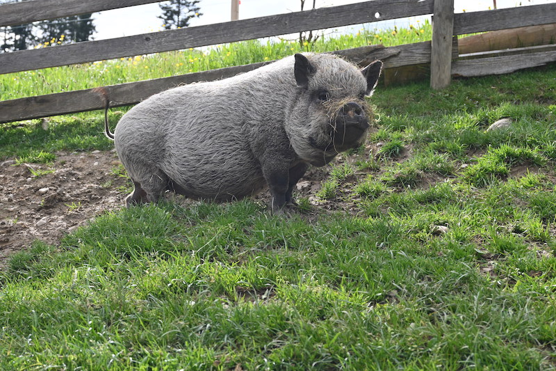 Tierbestand: 20 Milchkühe, 6 Zwergziegen, 2 Minipigs, 2 Ponys, 7 Seidenhühner mit Gockel, 3 Kaninchen, 6 Meerschweinchen, 1 Hund, Katzen.