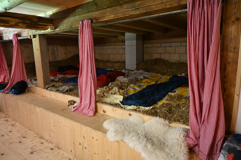 • Schlafen im Stroh in einem ge­schlossenen Raum mit Platz für rund 10 Personen. Im Raum gibt es auch einen grossen Esstisch und eine gemütliche Sitzecke. Grillplatz und Spielplatz kann ebenfalls genutzt werden.