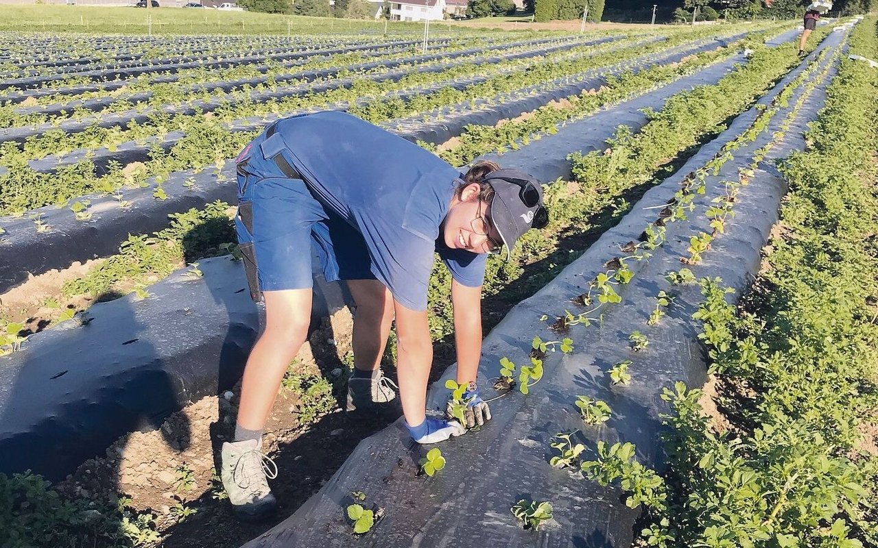 Es gab gleich zu Beginn alle Hände voll zu tun: Arbeit im Stall, auf dem Feld und in der Obstanlage, daneben der zweite Schnitt Ökoheu. Die Hauptarbeit in der ersten Woche war jedoch eher speziell: Mit Hilfe von fleissigen Helfern aus dem Bekanntenkreis setzten wir rund 34 000 Erdbeersetzlinge, welche im nächsten Juni zum Selberpflücken angeboten werden. Gesetzt haben wir während zwei Tagen alle Setzlinge von Hand in vorgelochte Dämme. Das war sehranstrengend, aber es hat mir trotzdem gut gefallen.
