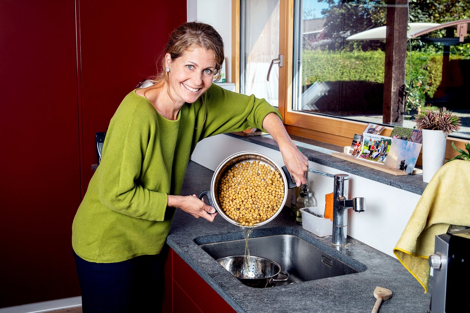Von Ersatzprodukten hält Heidi Lutstorf aber wenig. Statt falschem Schnitzel und Pflanzenwurst serviert sie Hülsenfrüchte vom eigenen Hof. Denn der Ackerbau des kleinen Mutterkuh-Betriebs mit fünf Dexter-Rindern wurde an die vegetarische Ernährung ihrer Familie angepasst. Kichererbsen und Borlotti-Bohnen kocht die Landfrau ein, um sie bei Bedarf sofort zur Hand zu haben. Dann kommt ihr Kombidampfgarer zum Einsatz. «Der kann alles», versichert sie. Diese Küchenwunderwaffe nutze sie auch zum Joghurt machen, Blanchieren oder ganz normal zum Backen von Brot und Güetzi.