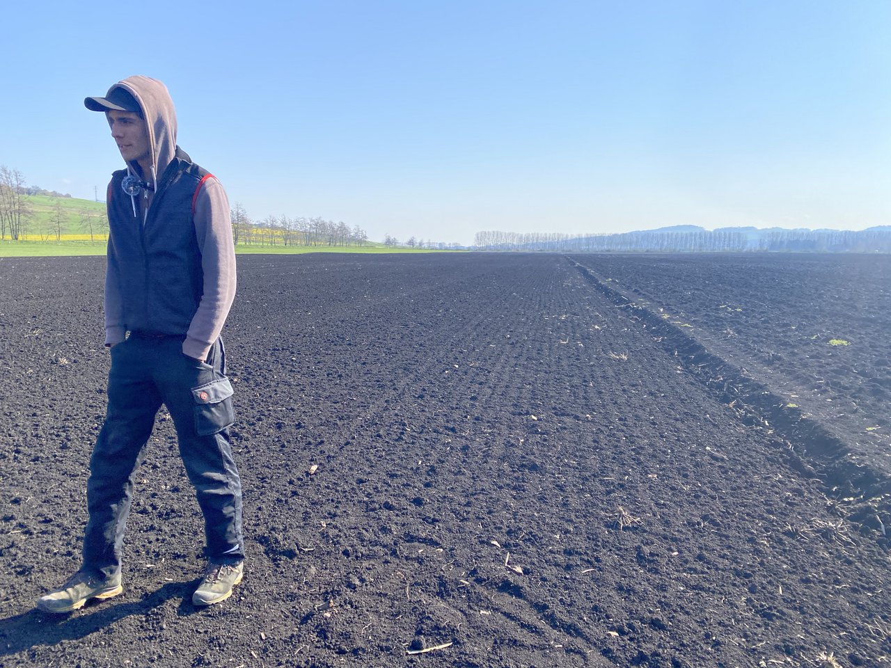 «Ich absolviere mein drittes Lehrjahr auf einem intensiven Ackerbaubetrieb, der 145 Hektaren umfasst – hier läuft es immer Vollgas», meint er und findet offenbar Gefallen daran. Dementsprechend finden wir seinen Lieblingsort nicht etwa neben einer schönen Kuh oder auf einem Hügel mit Sonnenuntergang, sondern auf dem 2 Meter hohen New Holland. «In meiner Freizeit ging ich meinem Bruder schon früher auf einem Lohnunternehmen aushelfen». Er zeigt in die Ferne des Kartoffelackers. «Diese Aussicht erklärt doch alles», sagt der begeisterte Junglandwirt. «Aber manchmal ist es schon weit – von Dändlikon nach Mathod», fügt er hinzu und lässt den Blick über den schwarzerdigen Acker schweifen.
