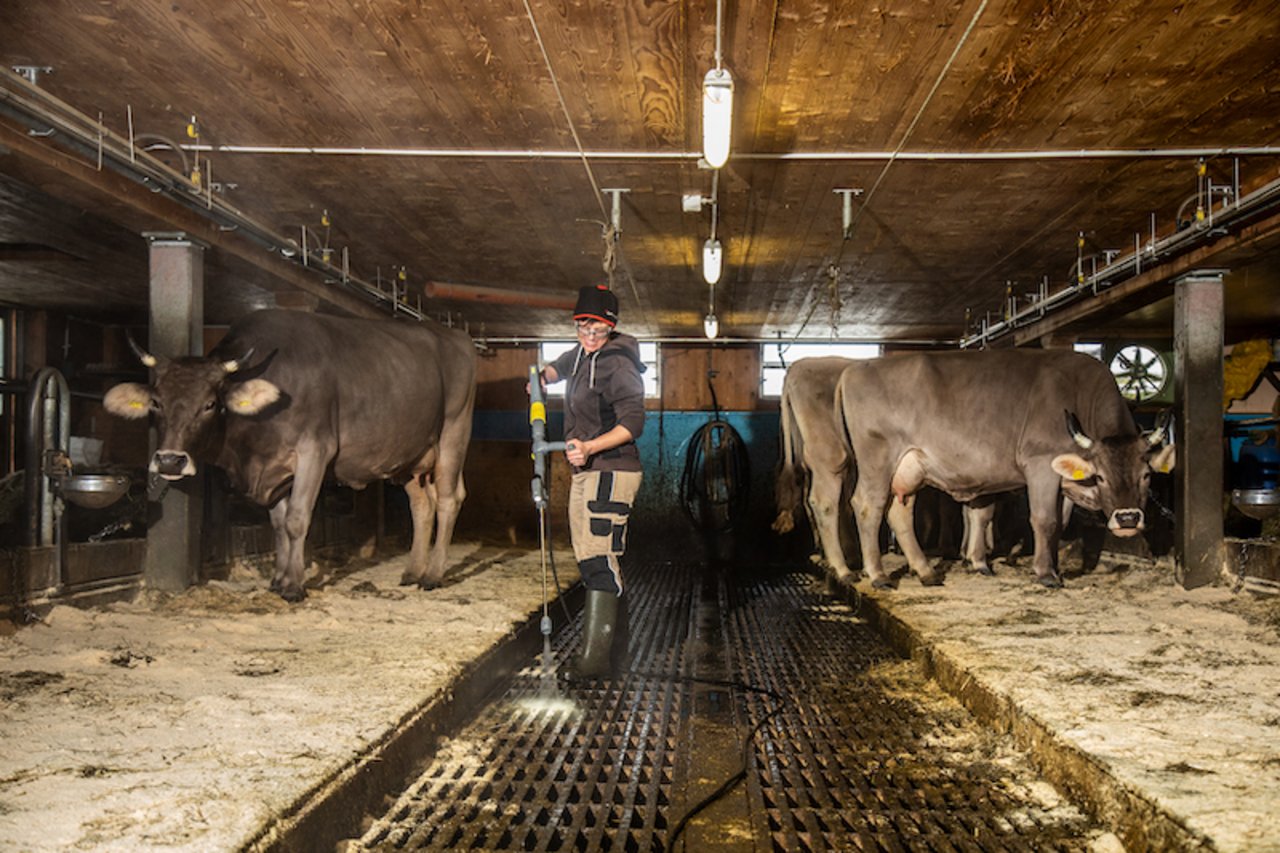 Eine warme Mütze mit Schweizerkreuz auf dem Kopf, in Gummistiefeln und Schürze spritzt Marianne Dietrich mit dem Kärcher den Traktor sauber. Wenn man sie so beobachtet, kann man fast nicht glauben, dass sie in drei Stunden mit ihren drei Kindern Hansueli, Christian und Franziska in die Skiferien fahren will. Gepackt ist bereits fertig, aber auf ihrer To-do-Liste stehen noch Milchkammer reinigen, Zopf backen und…