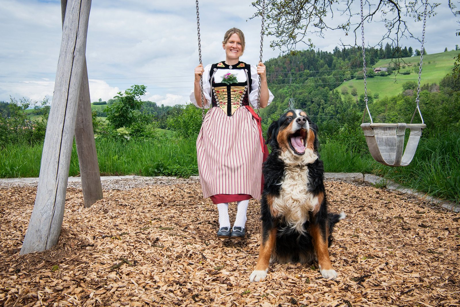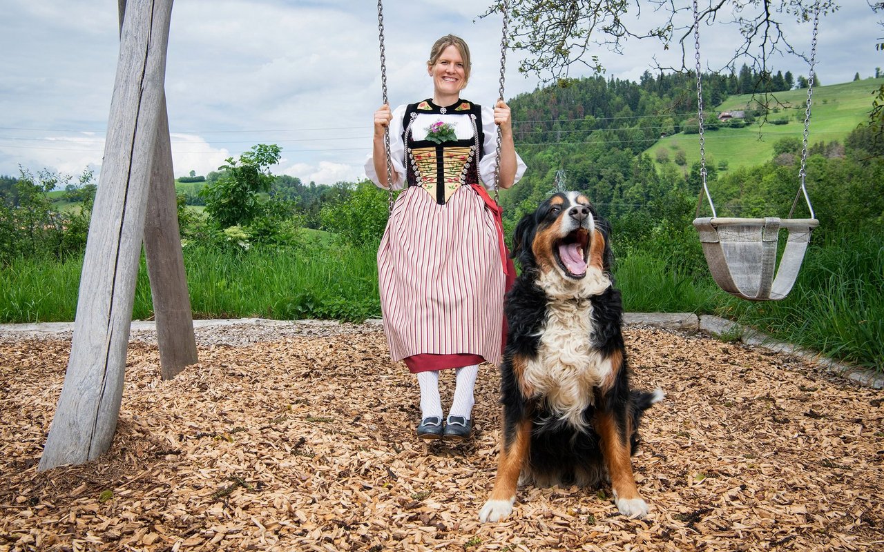 Gemächlich trottet die Berner Sennenhündin Amélie dem Besuch entgegen. Dabei wedelt sie freudig mit dem Schwanz und bellt zur Begrüssung, während nebenan die jungen Ziegen am Gehege hochspringen. Sie erhoffen sich wohl eine Streicheleinheit oder einen Leckerbissen. Es ist den Tieren auf dem Hof Horbermatt in Oberbalm, nahe der Stadt Bern anzumerken, dass sie Besuch gewohnt sind. Denn auf dem Biohof mit Rinderweidemast und Ackerbau, den Melanie Ramser mit ihrem Mann Philipp und den drei Kindern Moana, Diego und Elio bewirtschaftet, gehören viele Besucher zum Alltag dazu. «Wir haben sehr gerne Leute und besonders Kinder», betont die 36-Jährige. Und so ist es nicht verwunderlich, dass es auf dem Betrieb Angebote für Schulklassen gibt, Kinder ihren Geburtstag feiern, Ferientage verbringen, und auch ganze Gesellschaften bis 50 Personen bewirtet werden können.
