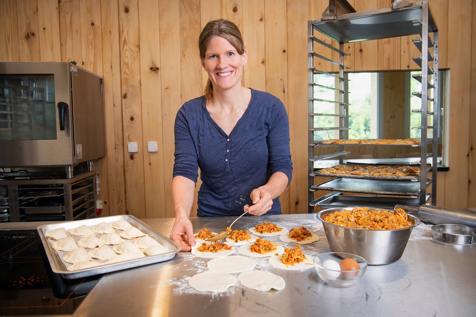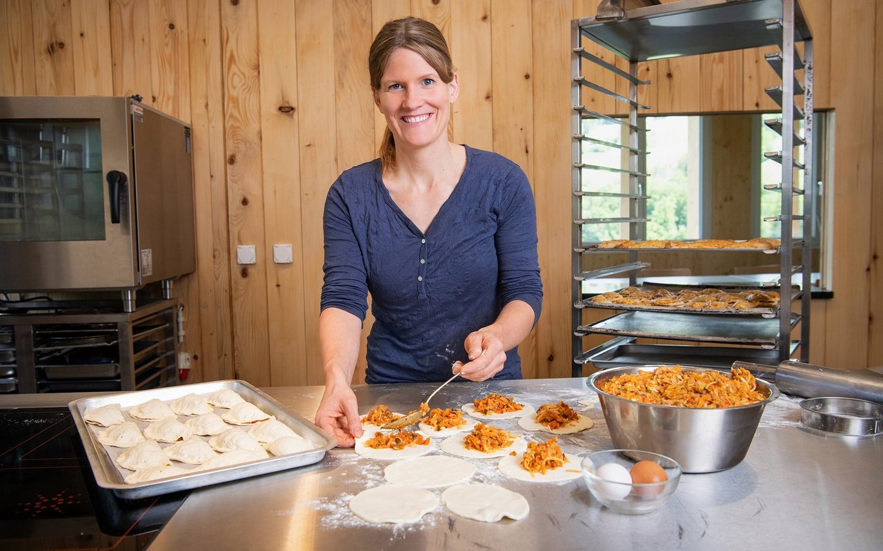 Dossier «SRF bi de Lüt – Landfrauenküche 2024» Freitag, 16. August 2024 Das Kochen zusammen mit einer Kinderschar und auch für Gesellschaften gestaltet sich seit diesem Frühling für Melanie Ramser viel einfacher. Die Familie konnte nach  zweijähriger Bewilligungsphase einen grösseren Gastraum mitsamt Gastroküche an ihr Bauernhaus anbauen. In dieser Küche verbringt die Bäuerin, die heuer Teilnehmerin der Landfrauenküche ist, viel Zeit. Sie kocht gerne und das am liebsten für viele Leute. «Wenn schon, denn schon», erklärt sie im Interview und lacht dabei. Täglich sitzen mindestens acht hungrige Mäuler am Tisch. «Kochen ist für mich Erholung», erklärt die dreifache Mutter. Oftmals kocht sie auch grössere Mengen vor und friert sie ein, um an Tagen darauf zurückzugreifen, an denen nicht viel Zeit zum Kochen bleibt. Immer ist ihr jedoch eine gesunde, ausgewogene, regionale Küche ohne Fertigprodukte wichtig.