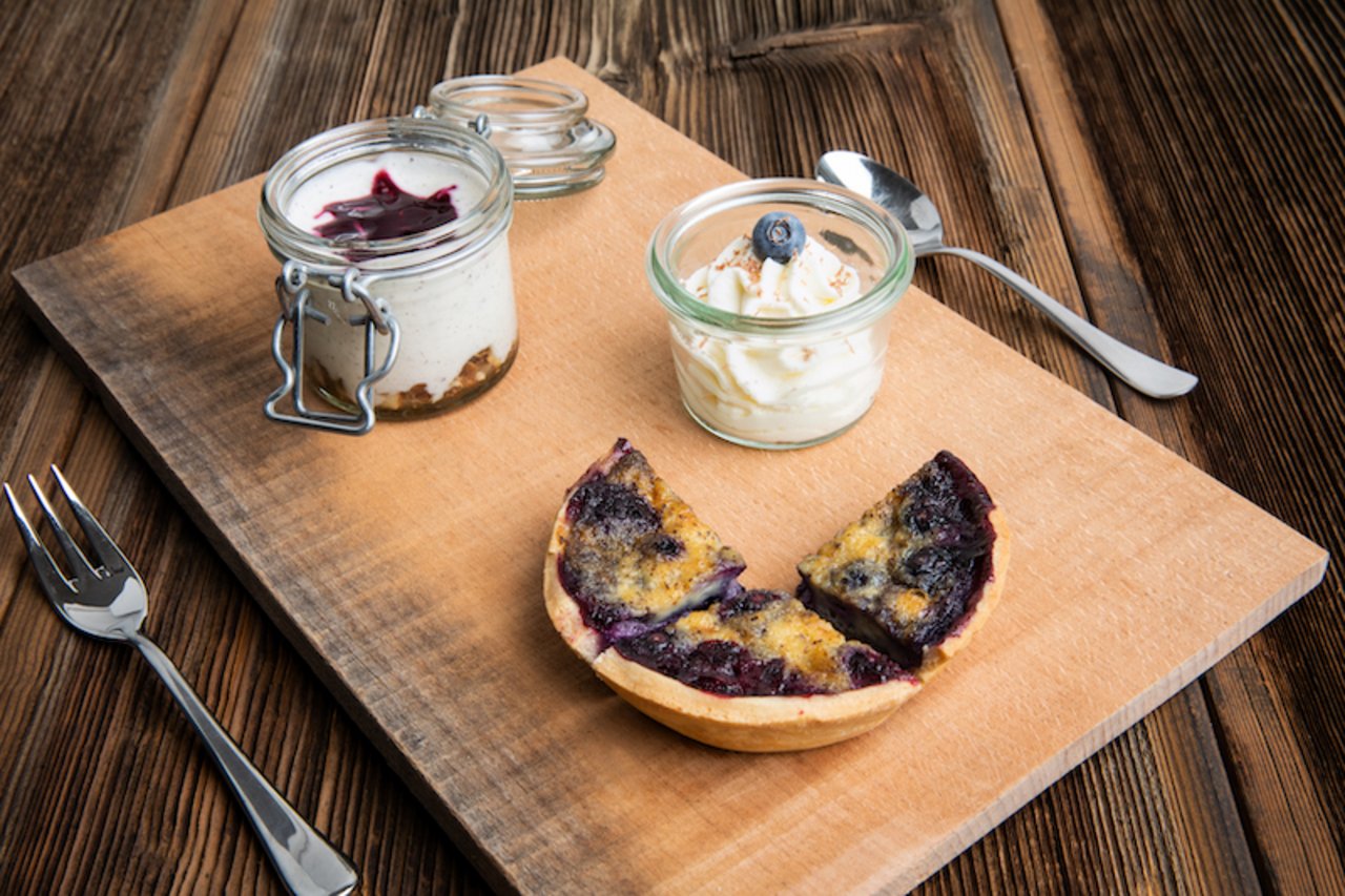 Den Heidelbeere-Nidelfladen in Stücke schneiden. Je ein Stück auf Dessertteller anrichten. Den Beerentraum im Glas dazu anrichten. Schlagrahm in ein Schälchen dressieren, mit Heidelbeere garnieren und dazu stellen.