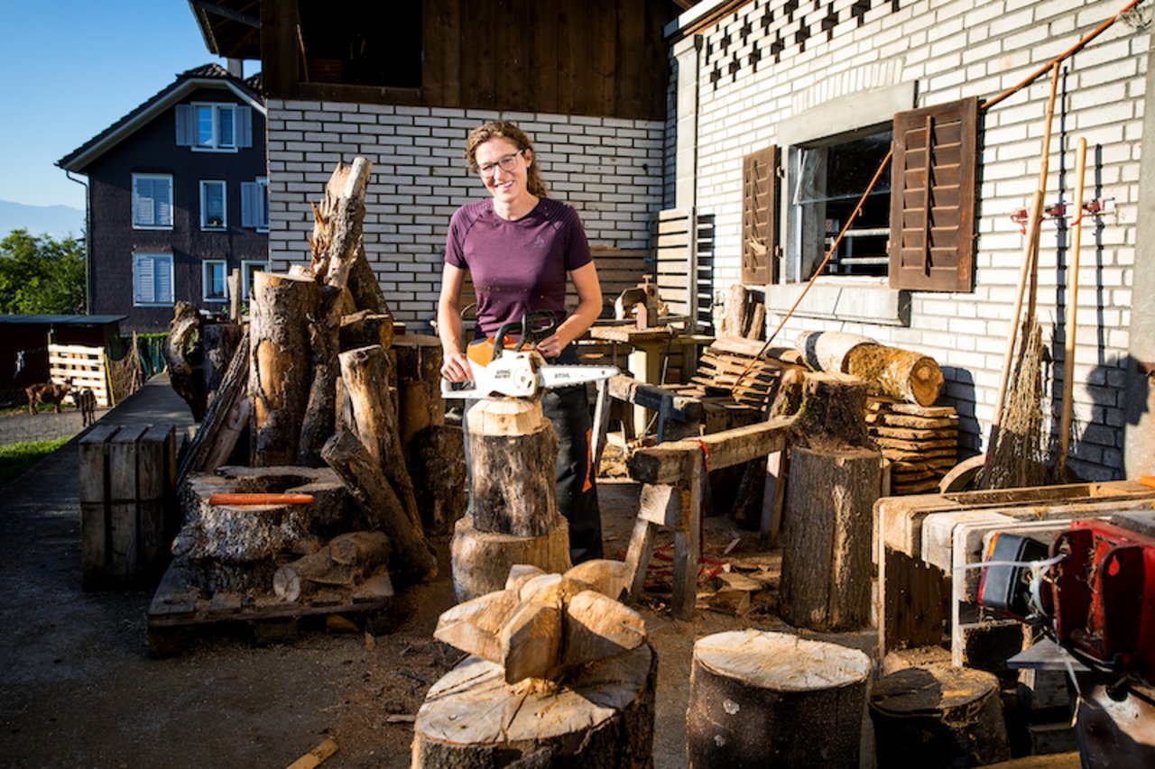 Eveline Villiger arbeitet gerne kunstvoll mit der Motorsäge. (Bild Ueli Christoffel/SRF)