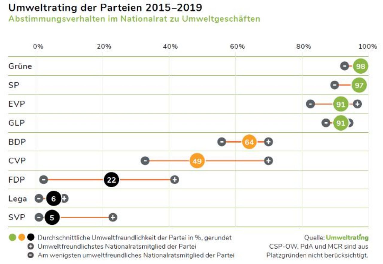 Mit einer durchschnittlichen Umweltfreundlichkeit von fünf Prozent bildet die SVP das Schlusslicht im Ranking, direkt gefolgt von der Lega und mit Abstand folgt die FDP. Das Feld wird angeführt von den Grünen und der SP (98 bzw. 97 Prozent). In der Mitte sind BDP und CVP.