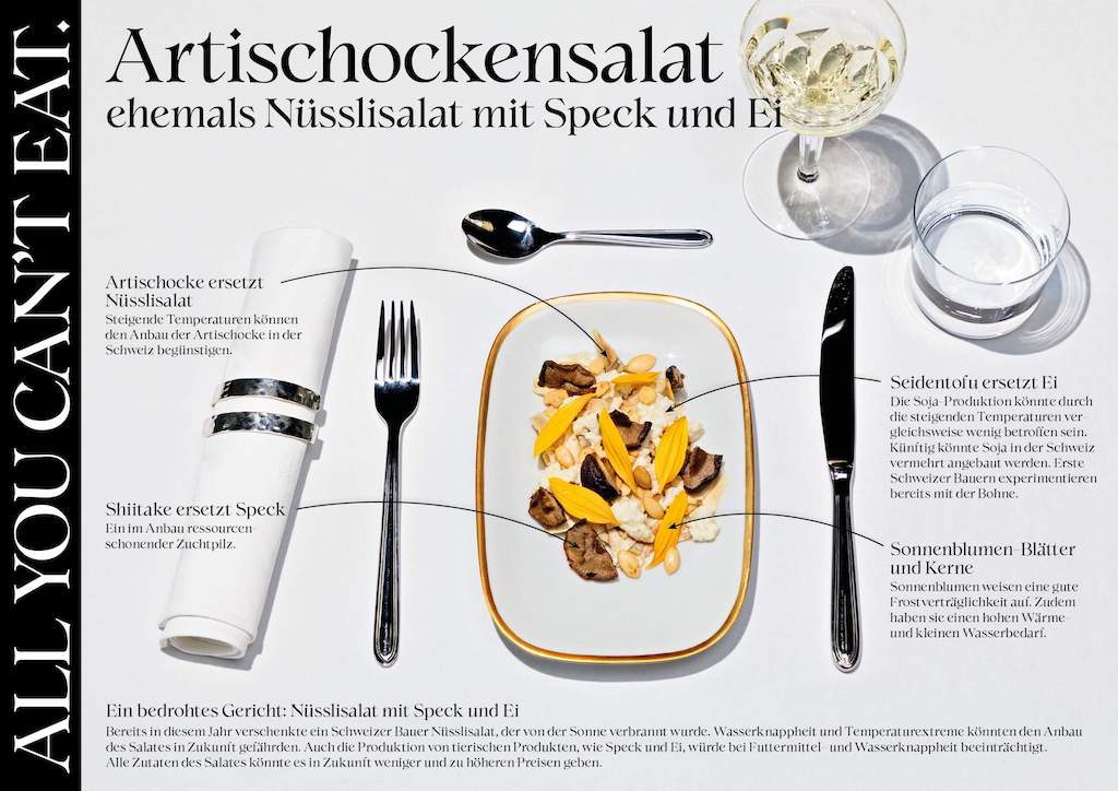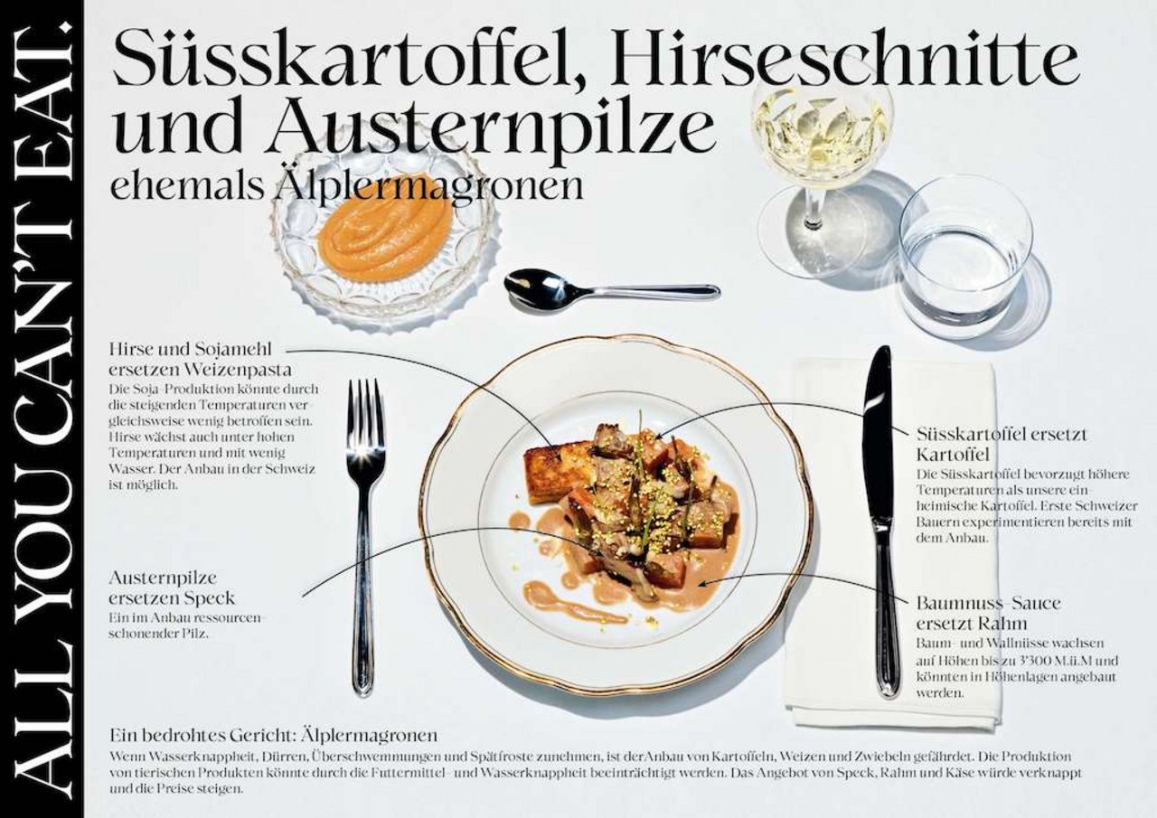 Die Umweltallianz hat typische Schweizer Gerichte neu interpretiert, je einen Dreigänger aus der Deutsch- und einen aus der Welschschweiz. Dabei ersetzen zwei Spitzenköche (Markus Burkhard und Julien Pansier) all jene Zutaten, die in der Schweiz durch den Klimawandel nicht mehr verfügbar wären, wie die Umweltorganisationen auf der Website allyoucanteat.ch erklären. Viel bleibt von den patriotischen Menüs nicht übrig, zumindest optisch haben die Gerichte keine Ähnlichkeit mehr mit dem Original.