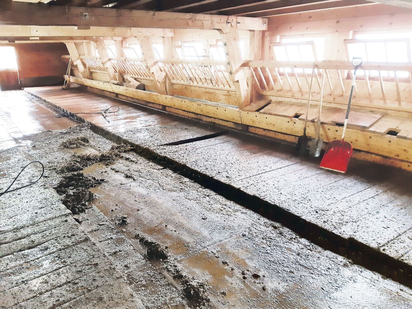 Der Anbindestall wird jedes Jahr abschliessend mit dem Kärcher gereinigt. Am Morgen erklärte mir Alain alles ganz genau: Neben dem Herauswaschen des Stalls sollte ich auch die Brunnentröge und den Platz rund um den Stall herum reinigen.