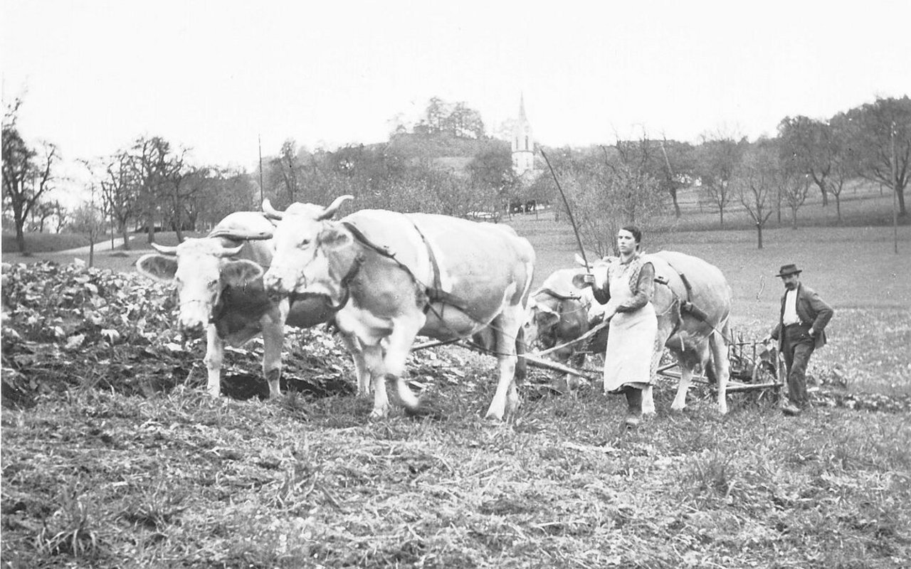 Doch Pferde waren auf den Höfen nicht so stark verbreitet, wie wir uns das etwa heute vorstellen. Sie waren für viele Bauern zu teuer. Typisch für Kleinbetriebe, die keine Bediensteten hatten, waren Kuhgespanne. Es gab aber auch grössere Betriebe mit Bediensteten, die Zugkühe hielten.