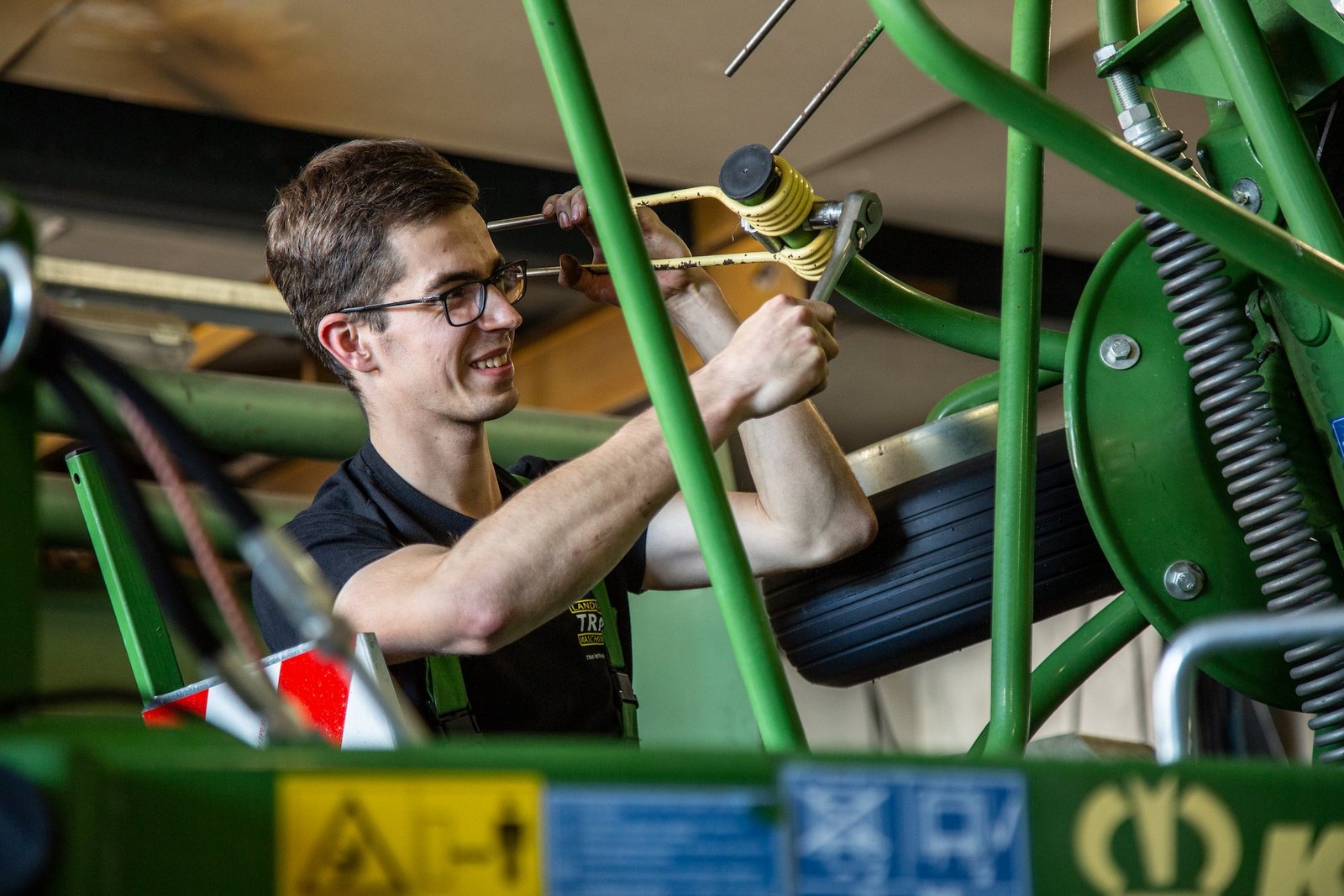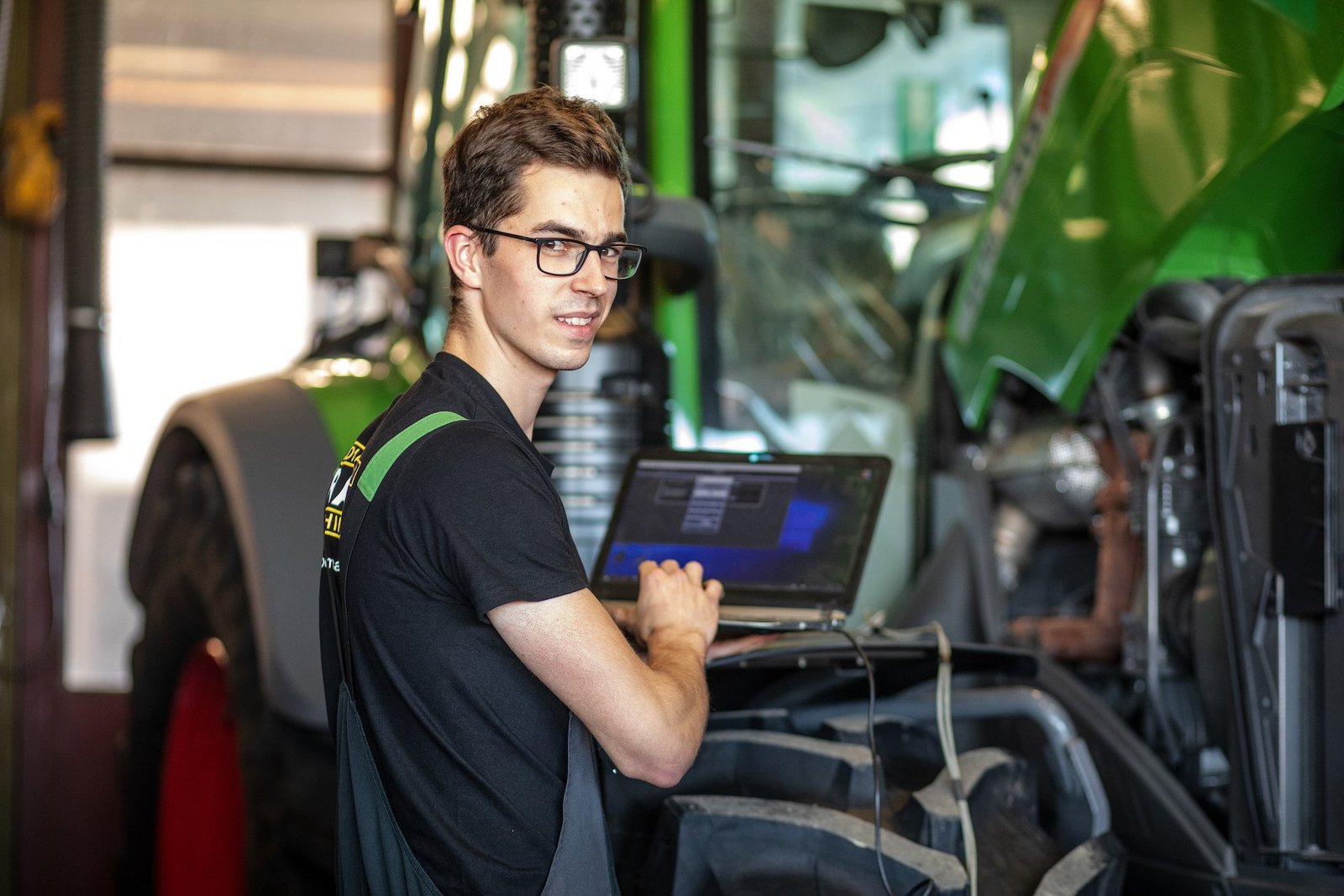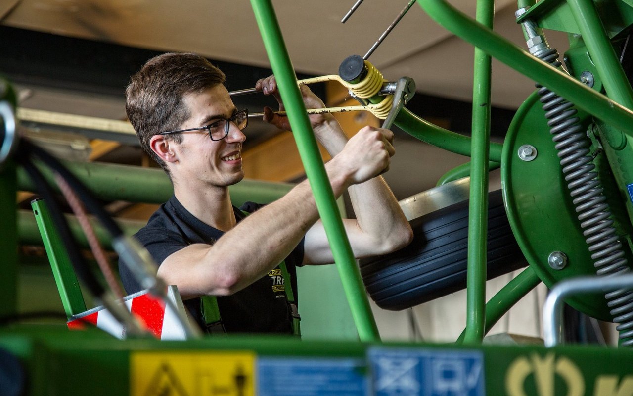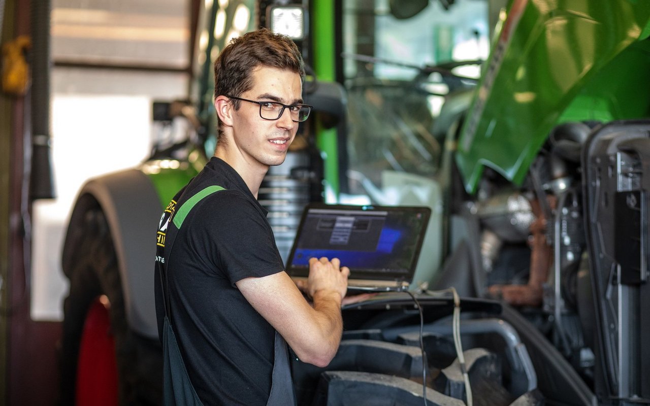 Sobald sich Sandro Weber mit seinen 1,93 m neben den Fendt Vario 313 stellt, erscheint dieser auf einmal gar nicht mehr so wuchtig. Lässig bedient der Landmaschinenmechaniker beim Fotoshooting mit der BauernZeitung seinen Laptop vom Kotflügel aus, als ob es sich um ein perfekt eingestelltes Stehpult handle. Das mache er nur fürs Foto, in der Regel setze er sich auf den Fahrersitz, wenn er die Elektronik nach Fehlern…