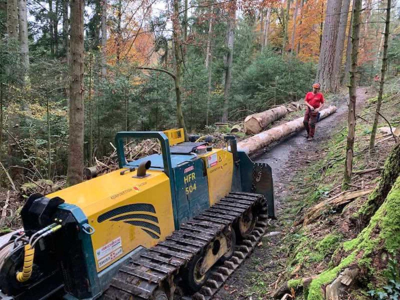 Im Erholungswald bei Meggen LU kommt lediglich die Kettensäge und aufgrund der schmalen Pfade ein zugemieteter selbstfahrender Raupenschlepper mit Seilwinde zum Einsatz. Das 2,5 t schwere Gefährt mit 6 t Zugkraft zieht ferngesteuert die gefällten dürren Käferholz-Stämme bis zum mit dem Forwarder befahrbaren Weg.