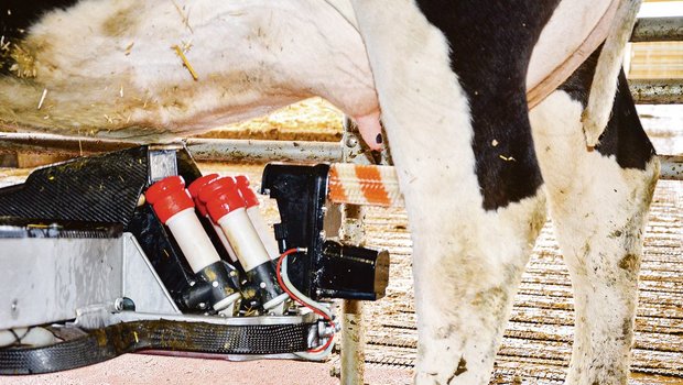 Gegen 20 Roboter der hellblauen Marke sind in der Schweiz in Betrieb, heisst es. Tendenz steigend. Das System habe ihn überzeugt, es sei verständlich aufgebaut und auf das Wichtigste reduziert. «Man sieht den Milchfluss quasi bis zum Tank», so Murer. Als einziges System wird von hinten gemolken (siehe Bild und Kasten). Melkroboter inklusive Weidetor gibt es für knapp 200 000 Franken.