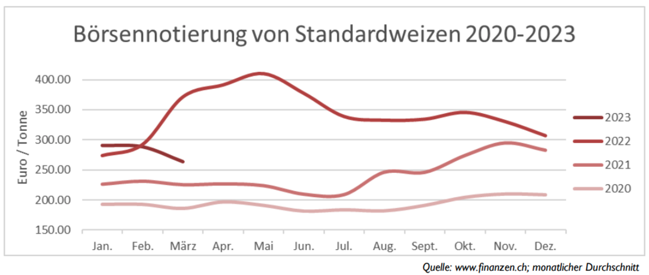 Anfang März fielen die internationalen Weizenpreise in Amerika und Europa weiter. So tief, wie dies seit 18 Monaten nicht mehr der Fall war. Zurzeit liegen die Preise bei noch knapp 260 Euro pro Tonne. Dafür gibt es zwei ausschlaggebende Gründe. Zum einen wurde eine Verlängerung des Getreide-Abkommens zwischen Russland und der Ukraine ausgehandelt, so dass Getreide aus der Ukraine weiterhin sicher über den Korridor der Schwarzmeerhäfen in alle Welt exportiert werden kann. Dafür hatten sich hochrangige russische Abgeordnete mit UN-Beauftragten in Genf getroffen. Die Verlängerung ist nur für 60 Tage vorgesehen, statt der ursprünglich geplanten 120 Tage, aber die Preise auf den Weltmärkten sind in der Folge nicht gestiegen.