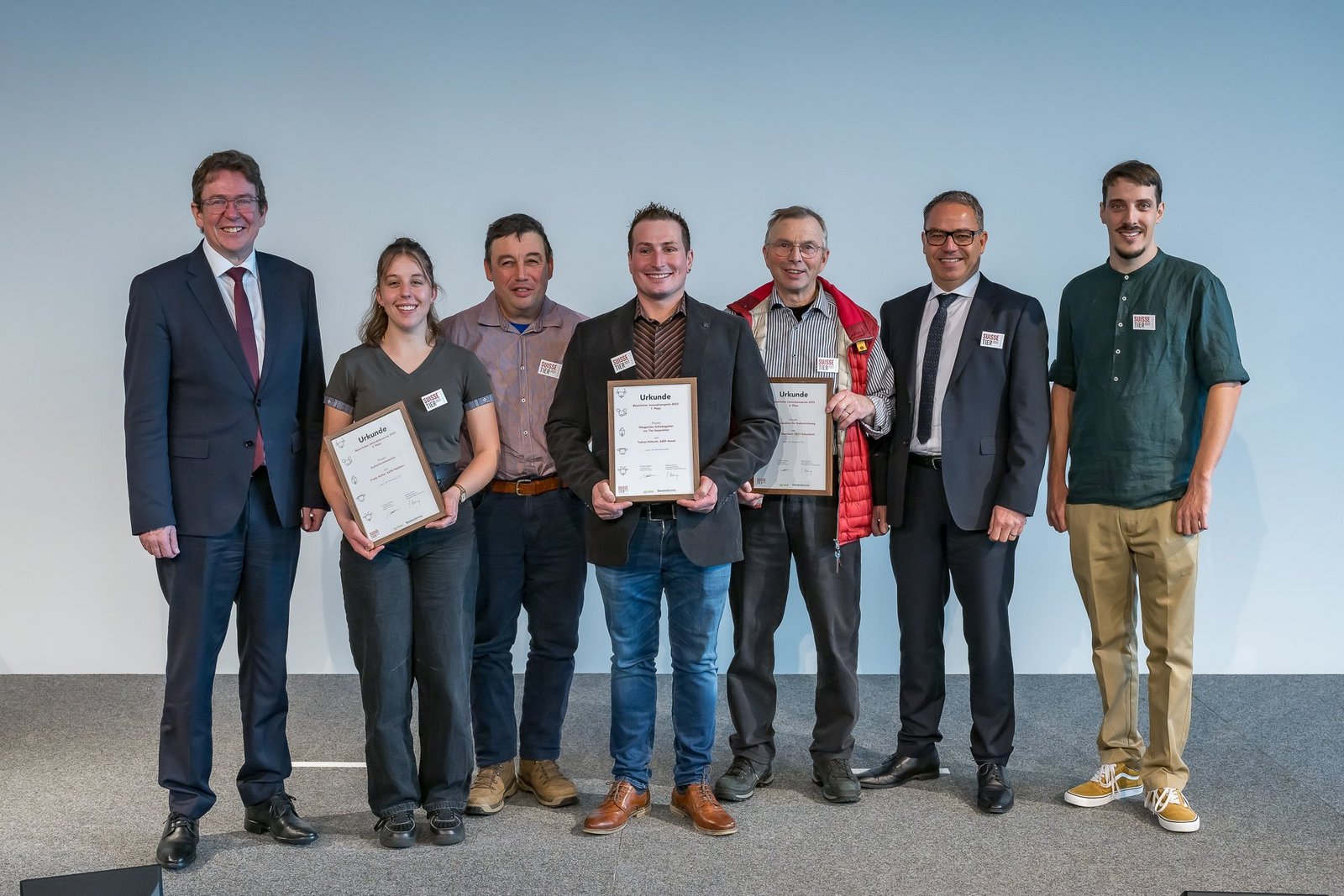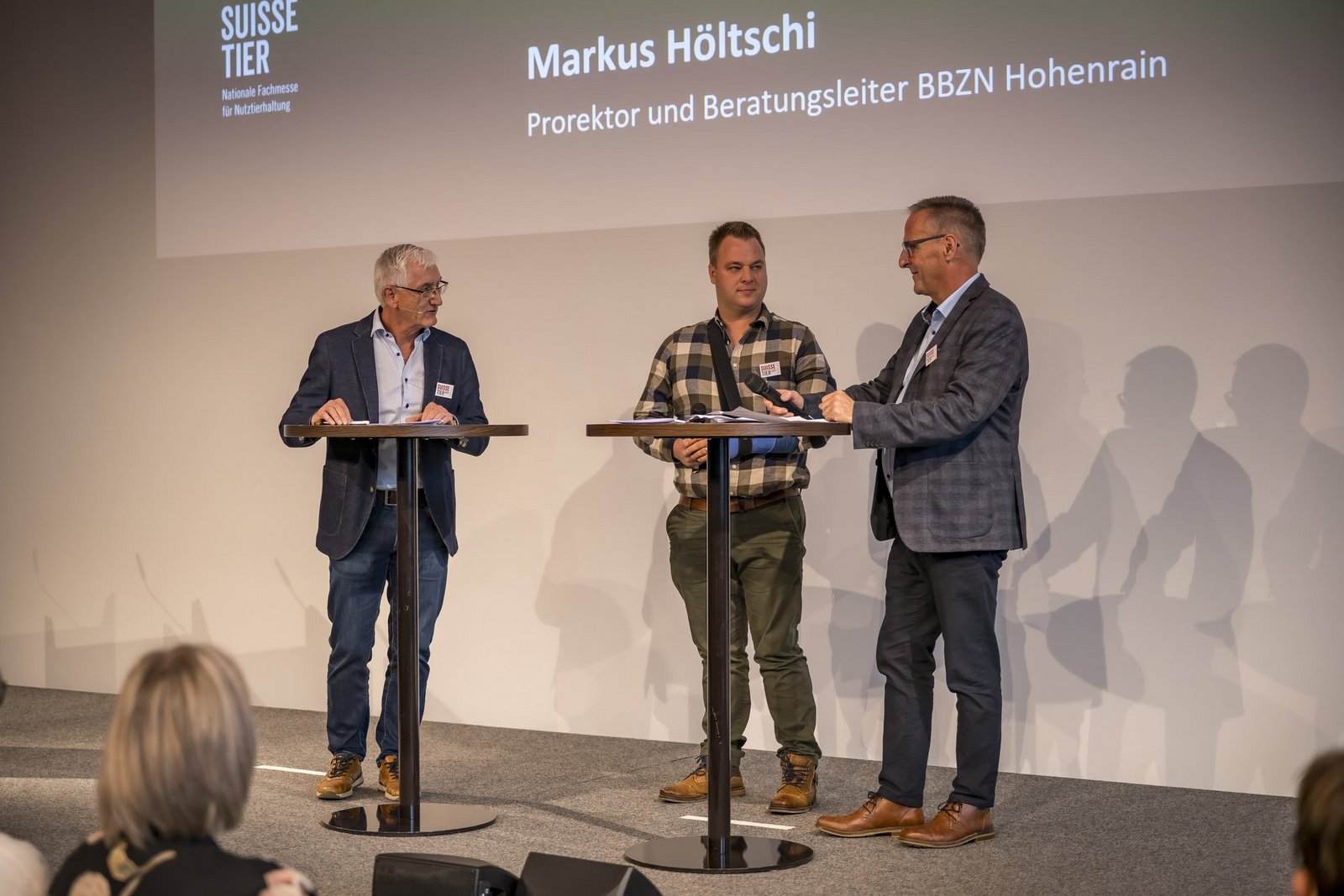 Abo Suisse Tier 2023 Innovative Projekte von Landwirten ausgezeichnet Freitag, 24. November 2023 Bereits die Eröffnung der Suisse Tier 2023 war für die Verantwortlichen eine runde Angelegenheit. Nach Geleitworten von Messebeirats-Präsident Meinrad Pfister tauschte sich Markus Höltschi, Prorektor des BBZN Hohenrain, mit den Landwirten Thomas und Marc Grüter vom Sonnhaldenhof in St. Urban LU zum Messe-Thema Effizienz aus. Im Anschluss verlieh die Schweizer Agrarmedien AG, zu der die BauernZeitung und das Fachmagazin «die grüne» gehören, drei Spezialpreise für herausragende gewerbliche Neuheiten und zeichnete drei findige bäuerliche Tüftler für ihre Innovationen aus.