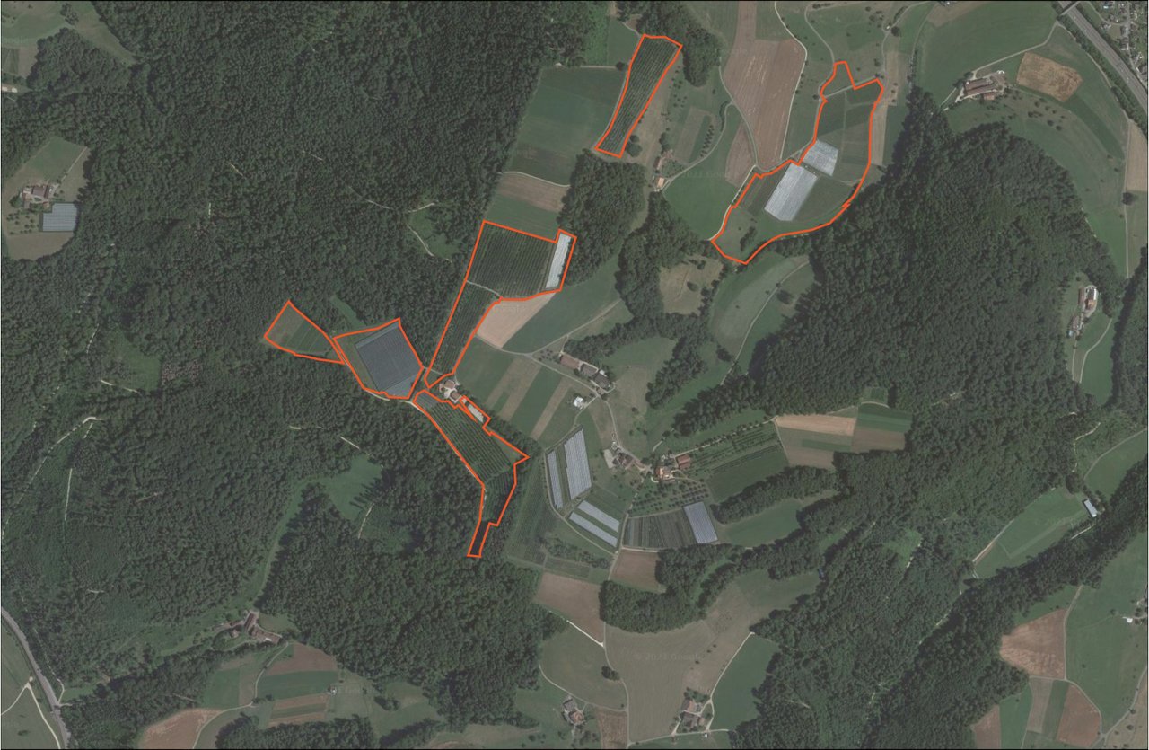 Kulturen 10 ha Strauchbeeren (Himbeeren, Brombeeren, Johannisbeeren, Stachelbeeren), 16 ha Industriekirschen