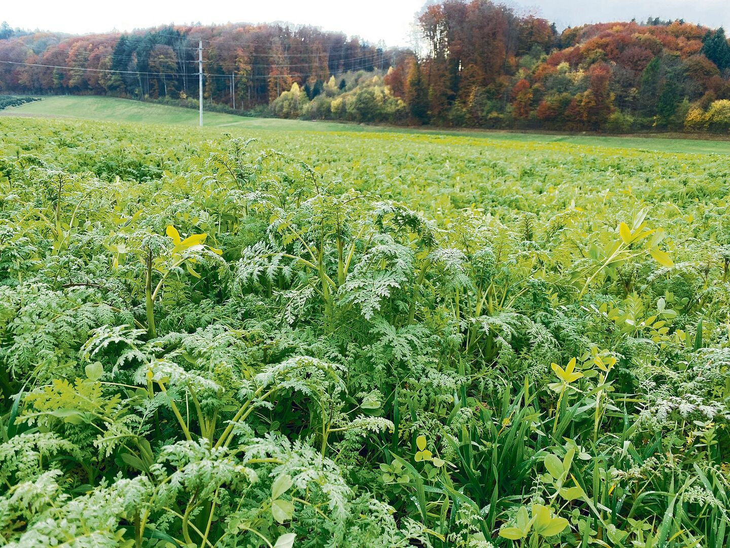 Das Ziel einer Gründüngung ist, den Boden zu bedecken. Gerade auch im Sommer sei das sinnvoll, denn nackte Erde könne sich bis 60 Grad aufheizen, erklärt Jean-Daniel Etter, «Regenwürmer und Mikroorganismen ziehen sich dann in grössere Tiefe zurück». Darüber hinaus bringen die Pflanzen Nährstoffe für die nächste Kultur in den Boden. Das heisst aber nicht, dass sie nicht auch selbst Dünger brauchen. «Wenn die Gründüngung im Herbst schwächelt, kann eine Güllegabe sinnvoll sein», meint der Fachmann. Auch 30 Einheiten Mineraldünger seien eine Möglichkeit. «Der Stickstoff geht nicht verloren, sondern wird von den Pflanzen aufgenommen und steht später der Folgekultur zur Verfügung». Stickstoff-Gaben seien aber klar nicht angezeigt, wenn die Gründüngung üppig und der Boden humös sei.