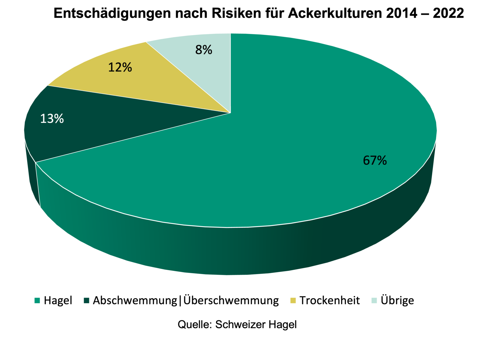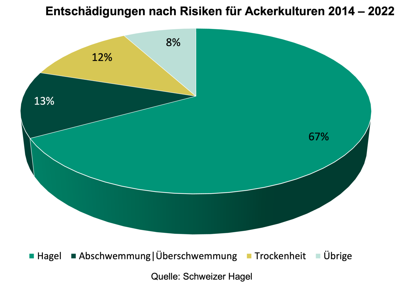 Die Analyse von Wetterrisiken ist das Kerngeschäft der Schweizer Hagel. Bei Ackerkulturen wird in rund 67 % der Fälle ein Ernteausfall durch Hagel verursacht. Darauf folgen die Risiken Abschwemmung/Überschwemmung und Trockenheit mit rund 13 % resp. 12 %. Die restlichen 8 % entfallen auf die Risiken Schneedruck, Sturm, Auswuchs, Wiederherstellungskosten, Hitze an Drescherbsen sowie Starkregen, Blitzschlag, Feuer, Erdrutsch und Übersarrung.