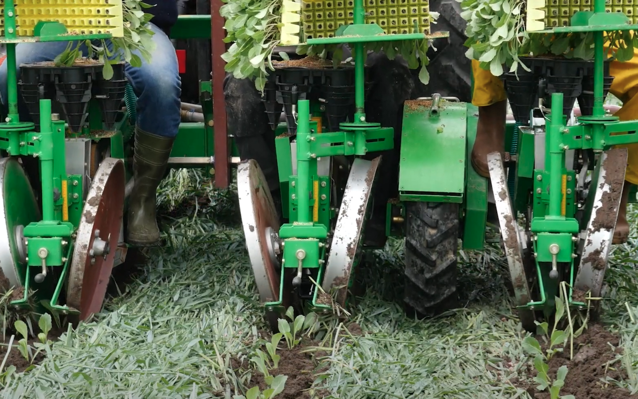 Speedy-Pflanzmaschine: Ergänzt wurde ein Düngerbehälter, um Dünger neben dem Pflanzband abzulegen. Eine zusätzliche Öffnungsscheibe bringt ihn in den Boden. Ausserdem hat man für den Konservierenden Anbau vor dem Pflanzschar eine Doppelscheibe montiert, um allfällige Ernterückstände oder Reste einer Gründüngung auf der Bodenoberfläche durchzuschneiden und so eine einwandfreie Pflanzarbeit zu ermöglichen. Über einen abgeänderten Sitz überträgt sich das Gewicht der pflanzenden Person auf das Pflanzelement, statt auf den Rahmen und hilft somit dabei, die erforderliche Tiefe einzuhalten. Eine zusätzliche, schmale Rolle an jedem Aggregat der Tiefenführungsrollen drückt die Setzlinge fest an, die zudem mit je etwa einem Deziliter Wasser versorgt werden.