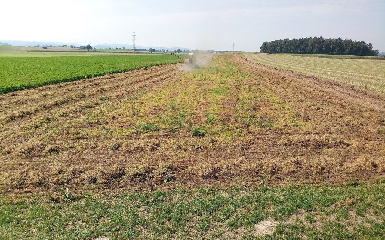 Dieses Jahr hat Simon Hauert Mitte März drei Hektaren Linsen in eine abgefrorene Gründüngung gesät. «Damit die Gründüngung trotz der schwachen Fröste eingeht, habe ich sie frostgewalzt», schildert er. Das Unkraut hielt er mit einem Vorauflaufherbizid in Schach, was für reines Erntegut wichtig ist. «Auf diese Weise muss ich nicht mit einem Striegel durch, wenn die Pflanzen noch sehr schwach sind, spare Treibstoff und Überfahrten», so seine Begründung. Schnecken seien ein Thema gewesen, wohl wegen der Überreste der Gründüngung. Zwar liefen die Linsen gut auf, allerdings erwies sich der Ölrettich aus der Gründüngung als sehr zäh und wuchs durch. «Ich weiss noch nicht, ob das bei der Ernte ein Problem wird», meint Hauert. Schwierigkeiten bereitete ihm bisher vor allem Klettenlabkraut, da dessen Samen kaum von reifen Linsen zu unterscheiden und daher schwer auszusortieren sind. Sein diesjähriger Versuch mit Kichererbsen als Stützkultur auf einer kleinen Fläche verlief bisher wenig erfolgreich: Wahrscheinlich werden die Kichererbsen nicht rechtzeitig ausreifen und es bräuchte eine höhere Saatdichte für eine bessere Stützfunktion.