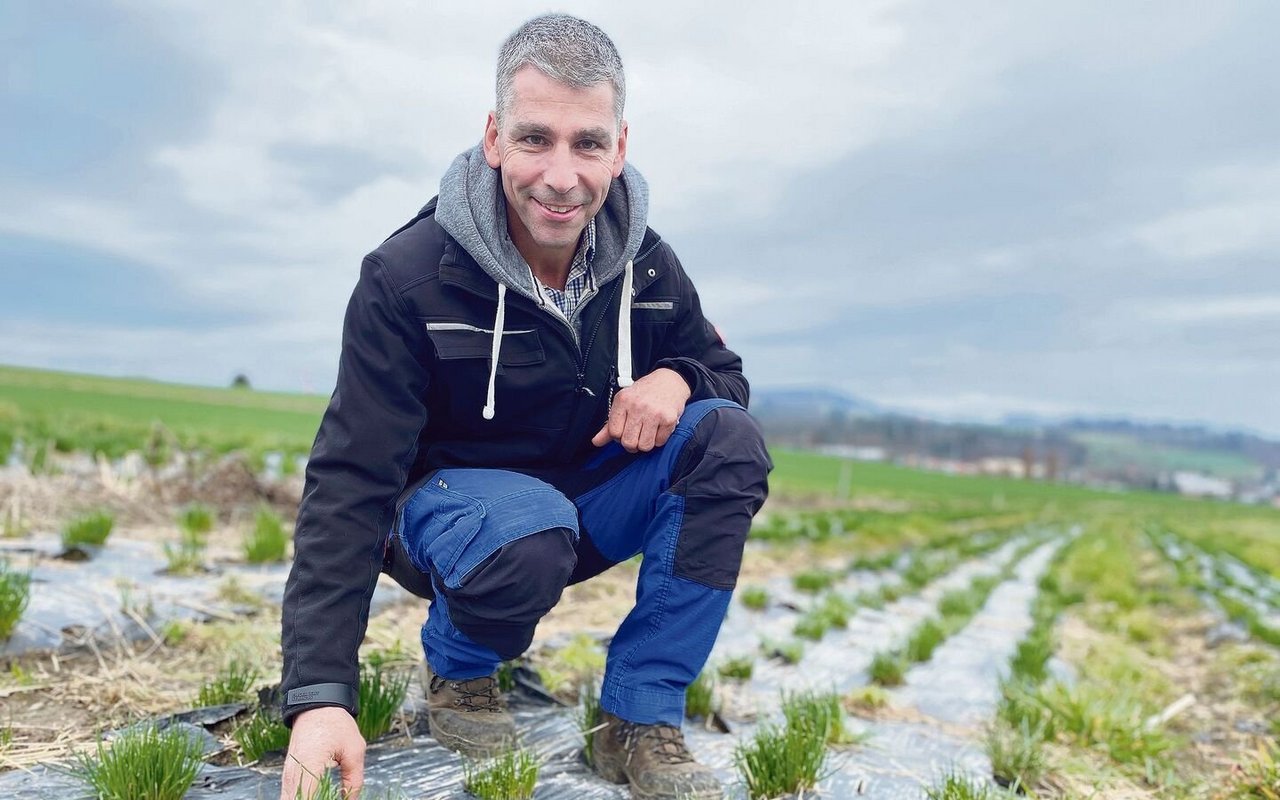 «Schnell, sonst sind alle Regenwürmer wieder weg», meint Stefan Eichholzer scherzhaft. Gerade hat er ein Grasbüschel am Rand der schwarzen Bahn aus Mulchfolie ausgerissen, um den Boden des Feldes für ein Foto zu freizulegen. Die Erde ist krümelig, von feinen Wurzeln durchzogen und Regenwürmer verschiedener Grösse sind darin unterwegs. Fruchtbar sieht das aus, und der Schnittlauch – der hier auf der Parzelle die…