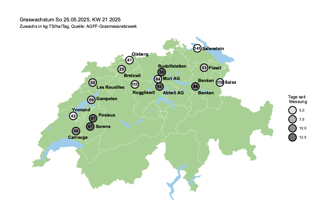 Nach der Wachstumsspitze folgt Ende Mai die Bestockungskrise. Im Grasmessnetz der AGFF wurden für die letzte Maiwoche verbreitet Wachstumsraten unter 70 kg TS/ha gemeldet. Dieser Rückgang ist in der Phase der Bestockungskrise normal: die Gräser bilden Ähren und Rispen, das Blattwachstum wird reduziert. Wenig Sonne und tiefere Temperaturen verstärken diesen Effekt. Für die kommende Woche ist mit einem ähnlichen Graswachstum zu rechnen. Deshalb sollten jetzt die Weideflächen vergrössert werden, um die Grashöhe im optimalen Bereich zu halten.