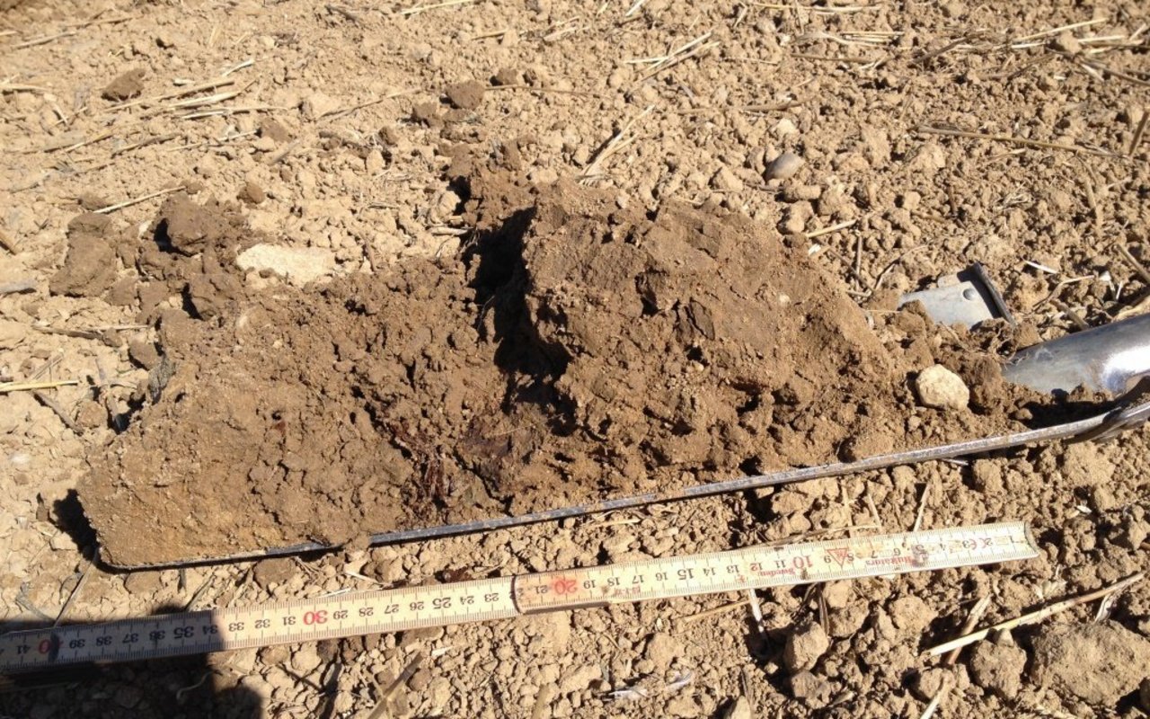 Etwas tiefer schaut man mit einem Teleskopprofil. Dabei wird mit der Palettgabel in einem Winkel von 30-45 Grad ein dreieckiges Stück Erde aus dem Feld gestochen. In diesen obersten 50-60 Zentimetern zeigen sich die Durchwurzelung und die Klumpengrösse. Je kleiner die Klumpen und je ungehinderter sich die Wurzeln ihren Weg nach unten bahnen können, desto besser. Regenwurmgänge zeigen die Aktivität dieser Bodenverbesserer und ein paar Tropfen Salzsäure (Vorsicht ätzend) den Kalkgehalt des Bodens.