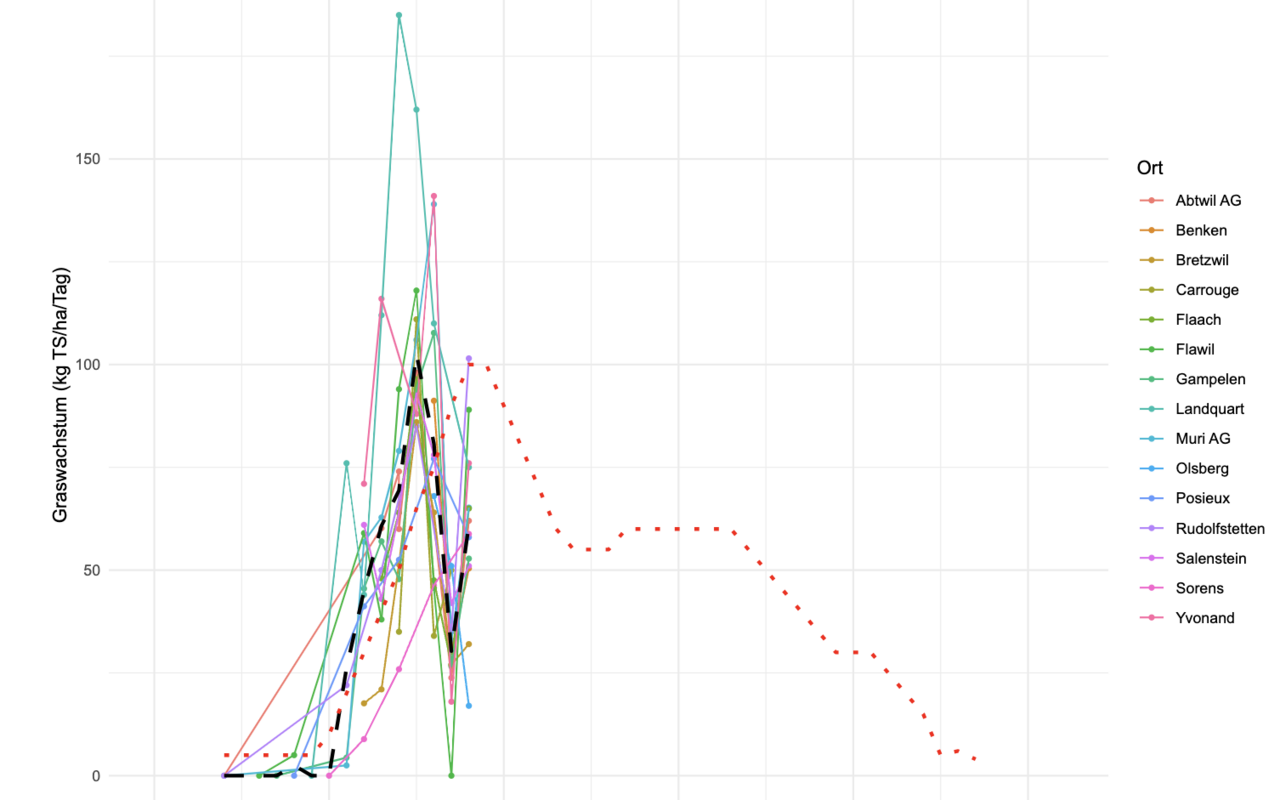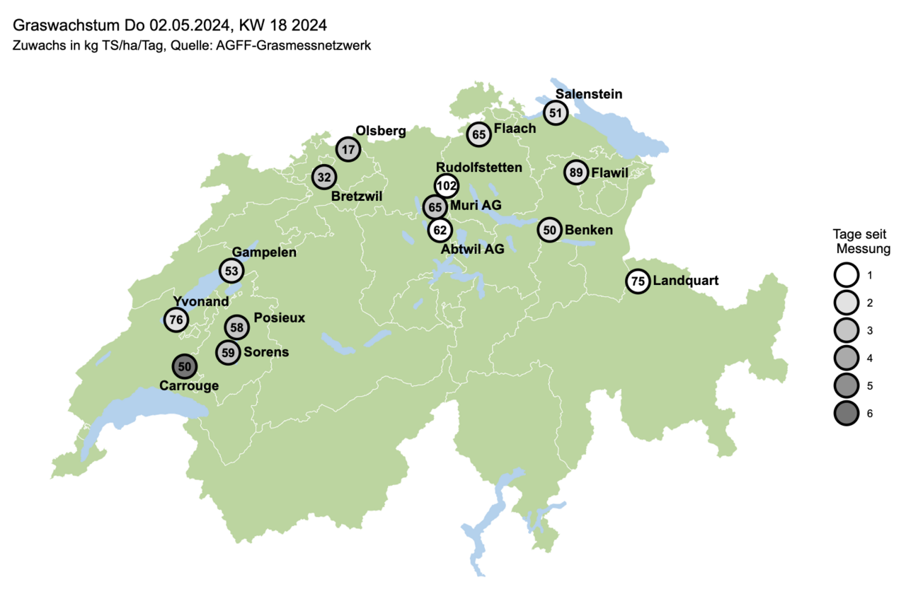 Die gemeldeten Graswachstumsraten dieser Woche liegen mit durchschnittlich rund 60 kg TS/ha/Tag eher an der unteren Grenze für diese Jahreszeit. Mit Höchsttemperaturen um die 15 °C ist nächste Woche ein Wachstum im ähnlichen Rahmen zu erwartet. Ältere Bestände kommen jetzt zügig ins Rispenschieben, die Verholzung nimmt zu: Solche Weideflächen sollten möglichst übersprungen werden.