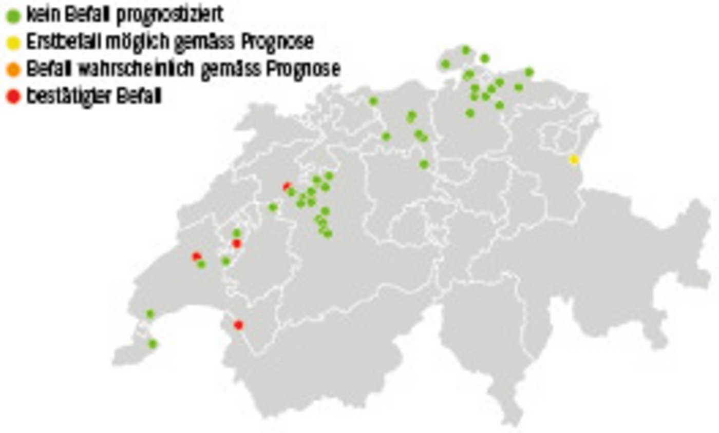 Das Prognosemodell Cercbet 1 kann anhand von lokalen Wetterdaten und der durchschnittlichen Befallsstärke des Vorjahres in der Region den Befallsbeginn von Cercospora bis zu drei Tage im Voraus berechnen. Die aktuellen Ergebnisse sind auf einer Karte auf bewaesserungsnetz.ch der Hafl ersichtlich (siehe Grafik).