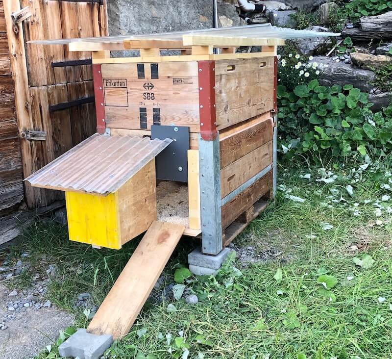 Und weil sie von dort stammen, brauchen sie natürlich auch einen tiptop perfekten Stall. Diesen hat Christoph gleich selber gebaut aus zwei Palettenrahmen. Das Hühnerhäuschen kann man oben aufklappen und es hat eine Sitzstange, eine Futterrinne und sogar ein Legenest.
