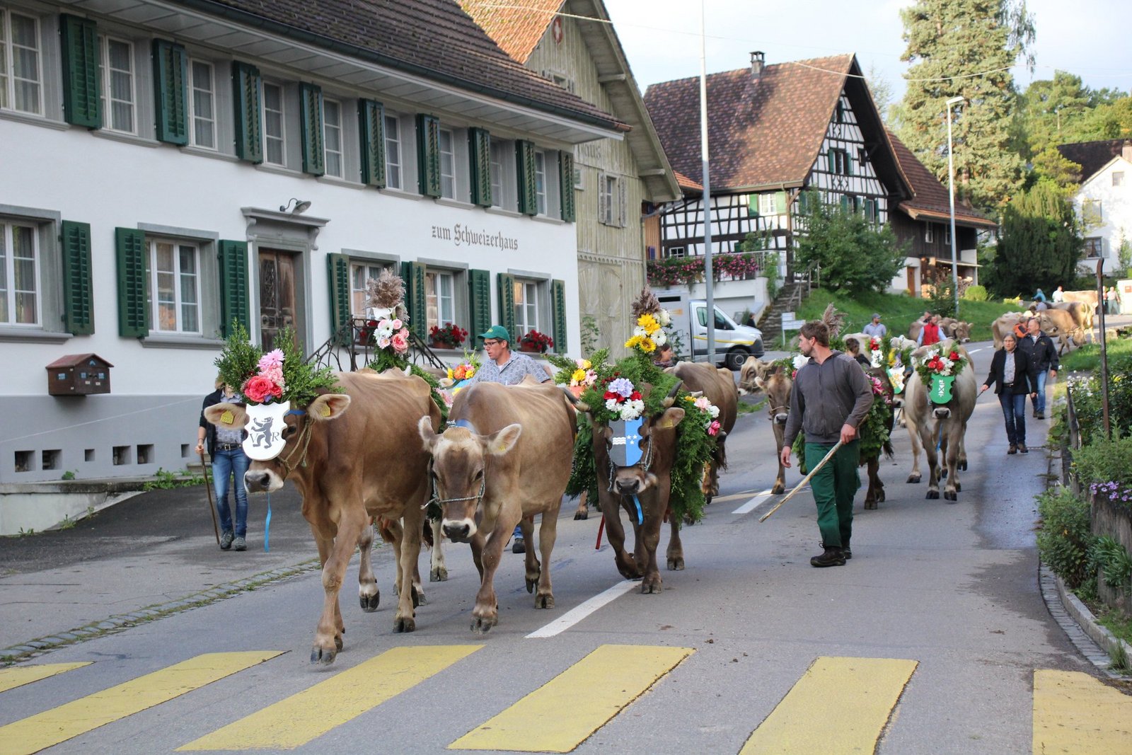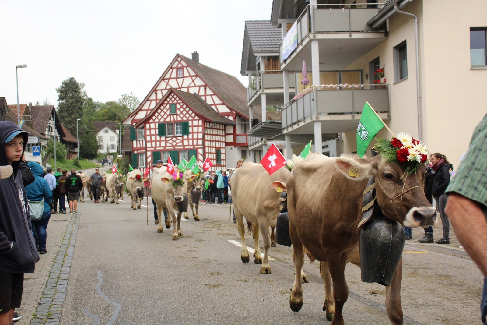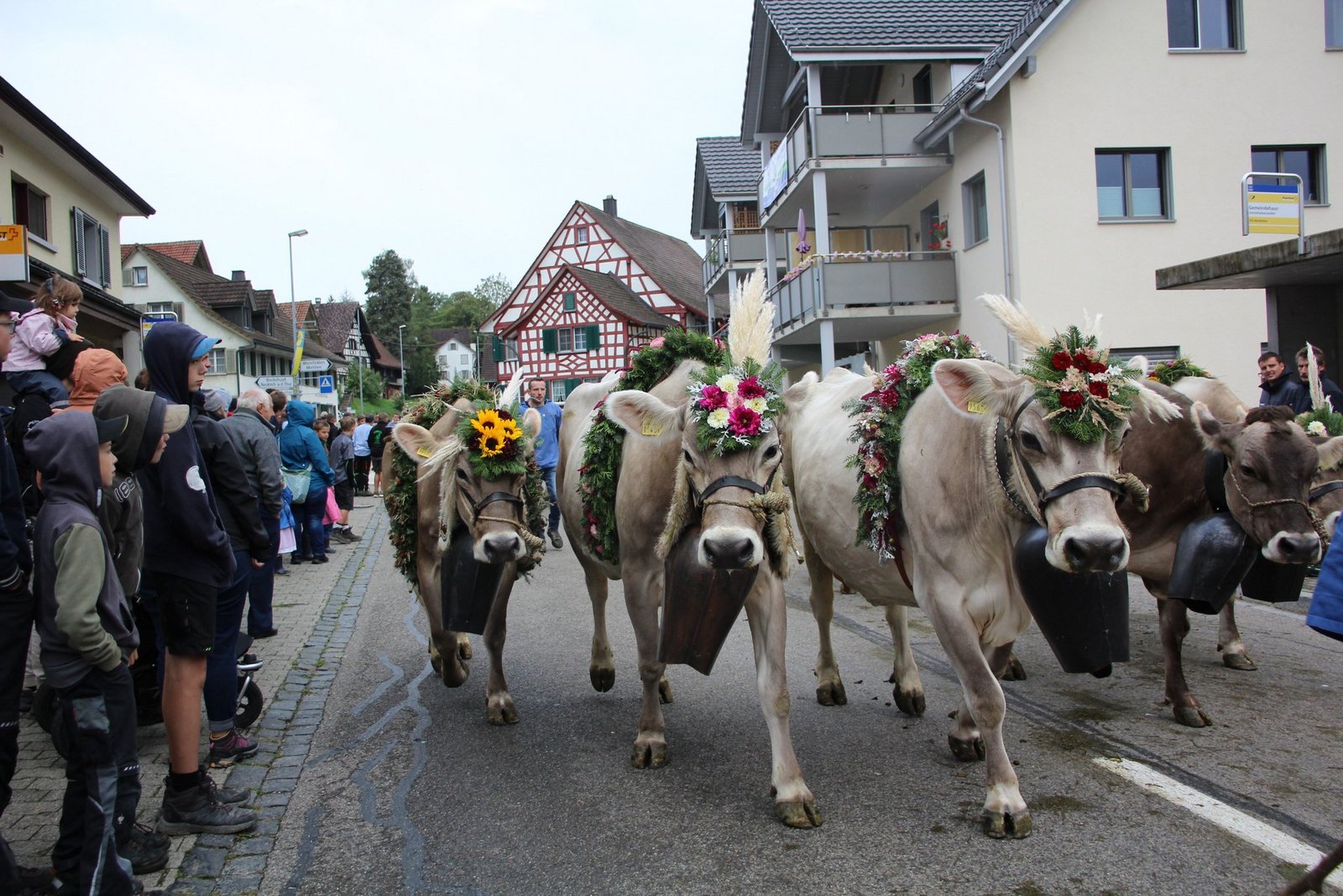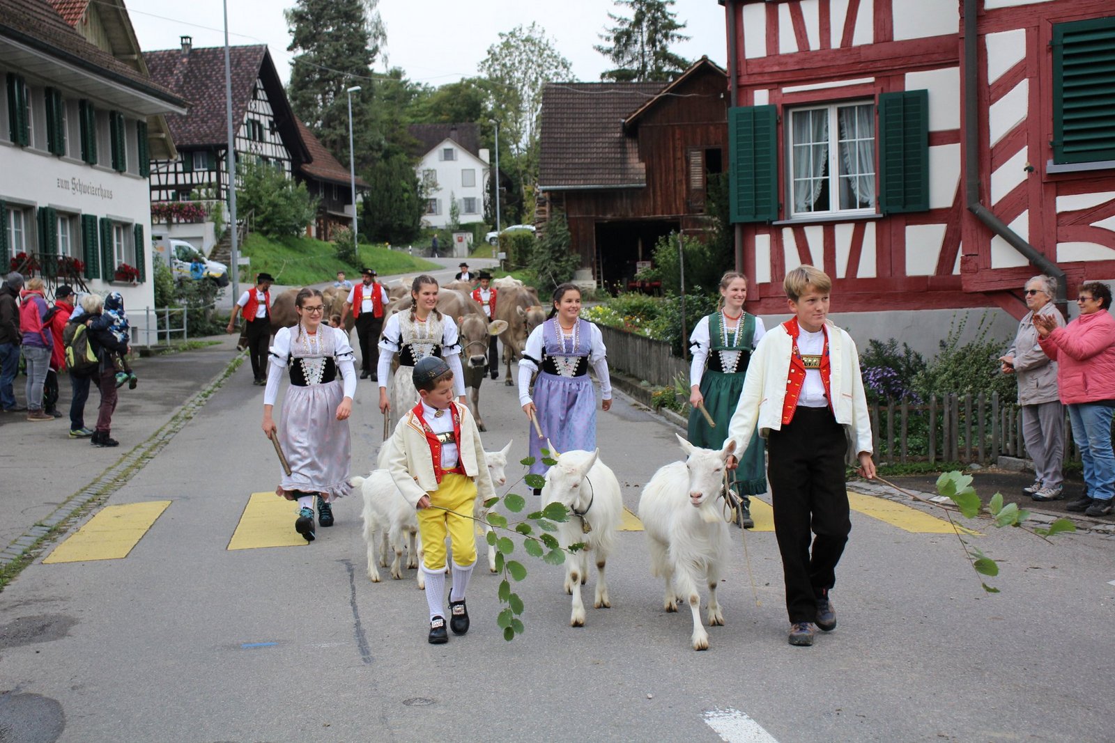 Glockengebimmel und Muhen kündigte schon von weitem die ersten Gruppen an.  Vom Nollen, vom  Hosenruck, aus Istighofen, Wuppenau, Heiligkreuz  und natürlich aus Schönholzerswilen kamen die 20 Gruppen mit festlich herausgeputzten und geschmückten Tieren, mit Bauern, Bäuerinnen und Kindern, nicht minder herausgeputzt mit Blumen in den zu Zöpfen geflochtenen Haaren und in Festtagstrachten gekleidet.