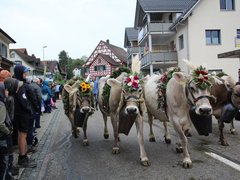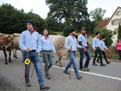 In einigen Bauernbetrieben scheint sich eine eigene Tracht entwickelt zu haben, mit Edelweisshemden und schwarzer Zipfelmütze oder mit Jacken mit der Aufschrift vom Hof. Bei allen war generationenübergreifend Berufsstolz und Traditionsbewusstsein zu spüren. Grosse und kleine Zuschauer, Familien mit Grosseltern und Kinder, alles schien auf den Beinen, denn an die im Thurgau noch einzige Viehschau, da geht man einfach und begleitet die Tiere bis hinauf zum Schauplatz.