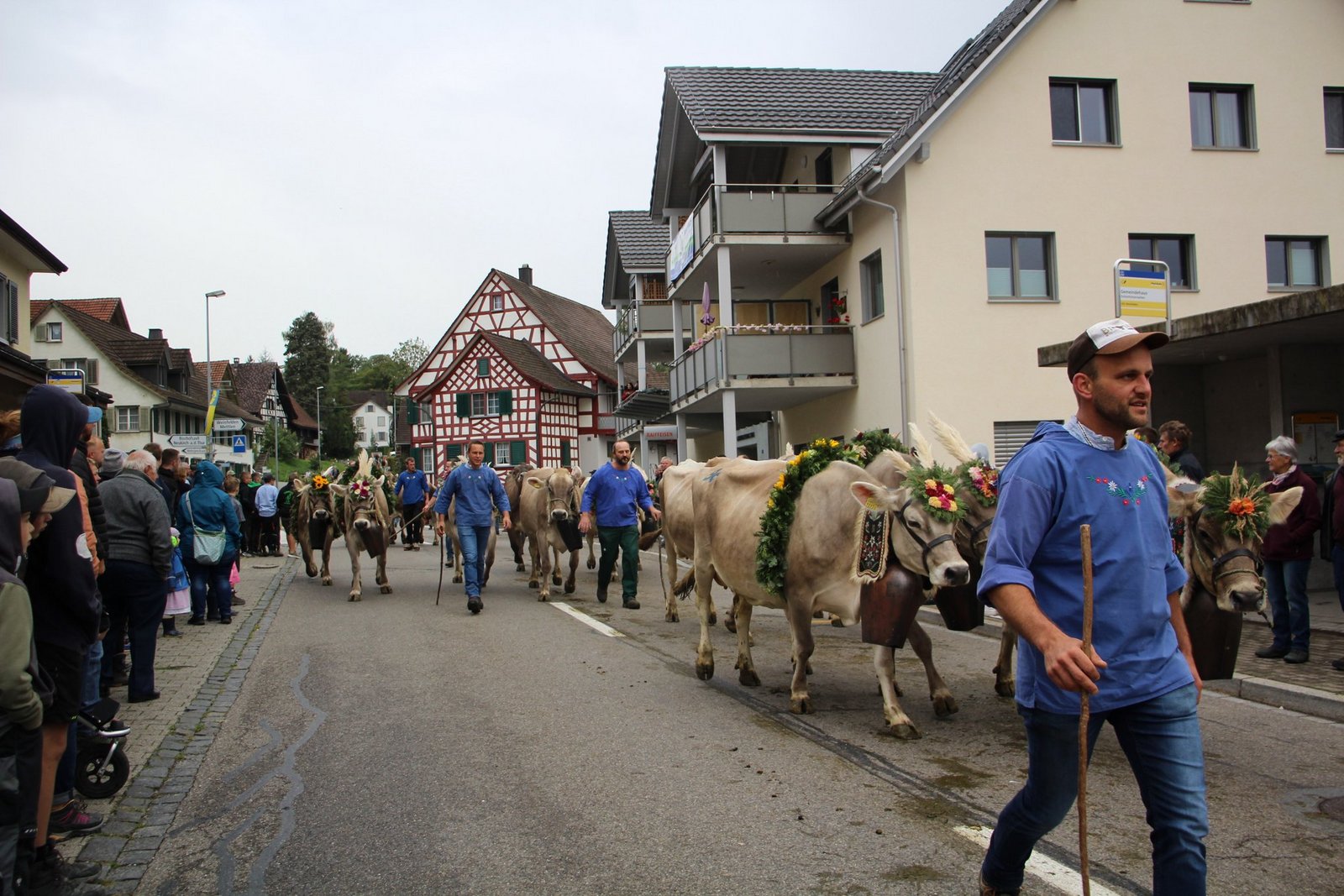 Auch Appenzeller Bauernfamilien leben in der Gegend und kamen traditionell daher mit Geissen, Geissbuben und -mädchen voraus. Die vier Sennen hinter den Schellenkühen gaben mit Zäuerli und Juchzer ihrer Freude Ausdruck, wie es sich gehört.