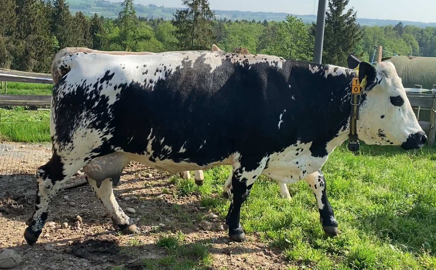 Beiläufig zupft Monica Graf ein paar Strohhalme vom Bauch der schwarz-weissen Mutterkuh vor ihr. Die Zeichnung auf ihrem gefleckten Fell ist auf beiden Körperseiten symmetrisch und macht schnell klar, dass es sich hier um einen nicht alltäglichen Anblick handelt. «Es gibt aktuell in der Schweiz gesamthaft 55 Pustertaler Sprinzen, davon 47 weibliche», erklärt Graf. Ihre Tiere waren unter den ersten, die importiert worden sind.