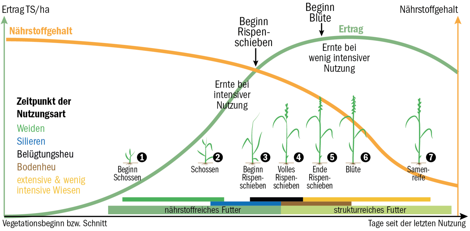 Der Schnittzeitpunkt ist ein Steuerungselement in der Grünlandnutzung. Er entscheidet über den Nährstoffgehalt und den Futterertrag des Ernteguts. Der erste Schnitt liefert ein Grossteil der Jahresfuttermenge. Weiter wird vor allem mit der ersten Nutzung die botanische Zusammensetzung und die Grasnarbendichte beeinflusst. Frühes Bestossen bei einer intensiven Umtriebsweide Intensive Futterbauwiesen und -weiden…