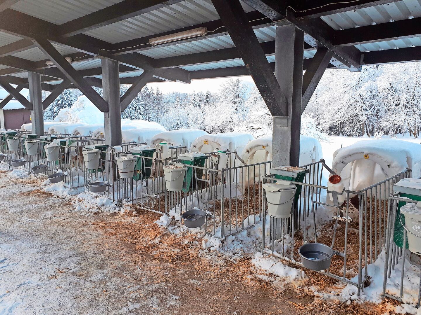 Und vielleicht am wichtigsten ist es, dem Kalb gerade im Winter ausreichende Mengen an Milch anzubieten. Grundsatz ist, dass das Kalb so viel trinken kann, wie es will. Nur dann ist gewährleistet, dass der durch die Kälte deutlich erhöhte Energiebedarf gedeckt wird und Energiereserven für die Abwehr von Infektionserregern vorhanden sind. Praktisch läuft das so, dass dem Kalb morgens und abends warme Milch im Nuckeleimer hingehängt wird, und zwar mindestens 4 Liter pro Mahlzeit in der ersten Lebenswoche und mindestens 5 Liter pro Mahlzeit ab der zweiten Lebenswoche. Trinkt das Kalb die Milch nicht aus, ist das kein Problem. Auch im weiteren Tagesverlauf kann sich das Tier an der dann kalten Milch bedienen, ohne dass Verdauungsstörungen auftreten. Nur bei sehr starker Kälte empfiehlt es sich, die Eimer bereits nach einer Stunde wieder wegzunehmen. So sind es tatsächlich nur wenige Massnahmen, mit denen wir unseren Kälbern das (Über-)Leben in der kalten Jahreszeit wesentlich erleichtern können. Gesunde Tränker werden es danken.
