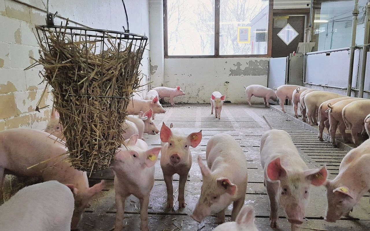 Ein Mastschwein verbringt seine Tage hauptsächlich mit Essen und Schlafen, erklärt Aaron Milz. «Es hat die Möglichkeit, sich frei zu bewegen und sich mit Strohraufen oder Strohwürfeln zu beschäftigen, um dem natürlichen Trieb gerecht zu werden.» Die Schweine leben in Gruppen von 20 Tieren in sogenannten Buchten. Haben sie das Gewicht von 60 kg erreicht, werden sie nochmals in kleinere Gruppen aufgeteilt, damit sie mehr Platz haben.