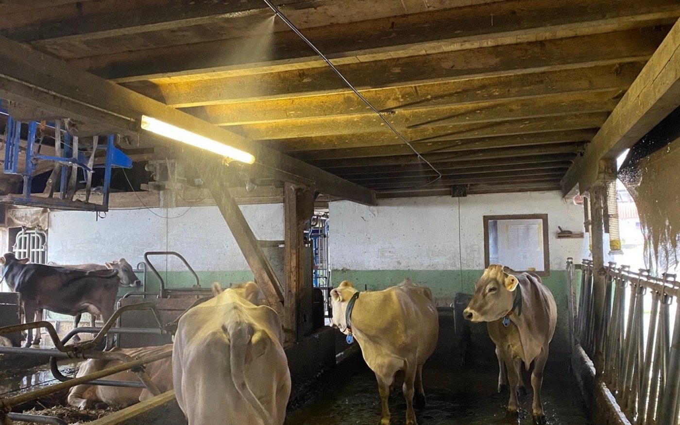 «Ich habe zuerst eine Probedüse montiert, um zu schauen, wie die Kühe auf die Wasserdusche reagieren», sagt er. «Reika hat es ziemlich genossen», also monierte er die Schläuche an die Decke im Fressbereich und am Eingang zur Weide. Am Eingang zum Melkstand installierte er die Nebeldüsen in Euterhöhe, «die Fliegen werden vom feinen Nebel verscheucht und gelangen nicht mehr in den Melkstand», sagt er zufrieden.