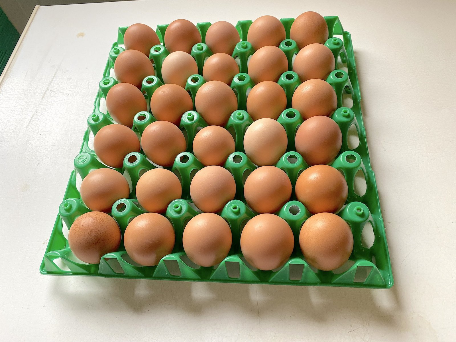 Die Kosten pro Ei sind bei Lohmann Dual höher, da diese Hennen weniger Eier legen als Hybriden. «Sie kommen später in die Legephase, die Legekurve steigt langsamer an und die Eier fallen kleiner aus», schildert Adrian Manser. Zudem zeigen sie verschiedene Braunschattierungen statt einer einheitlichen Farbe. Die Ei AG löst das Problem, indem bei der Sortierung schon Eier ab 45 Gramm zum regulären Preis vermarktet werden, während die übliche Normalgrösse bei 53 Gramm liegt. Die Kundschaft im Laden zahlt somit mehr für kleinere Eier. Die Kommunikation zur Idee des Zweinutzungshuhns als Alternative zum Kükentöten funktioniert offenbar, denn mittlerweile liefern sechs Produzenten Lohmann-Dual-Eier an die Ei AG.