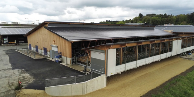 Der Neubau des Rindviehstalls am Inforama Rütti hat Platz für 62 Kühe und 35 Kälber. Er ersetzt den alten Stall, der nicht mehr den heutigen Vorgaben des Tierschutzes entsprochen hatte. Der neue - mehrheitlich aus Schweizer Holz gebaute - Stall verfügt über einen grosszügig bemessenen Laufstall.