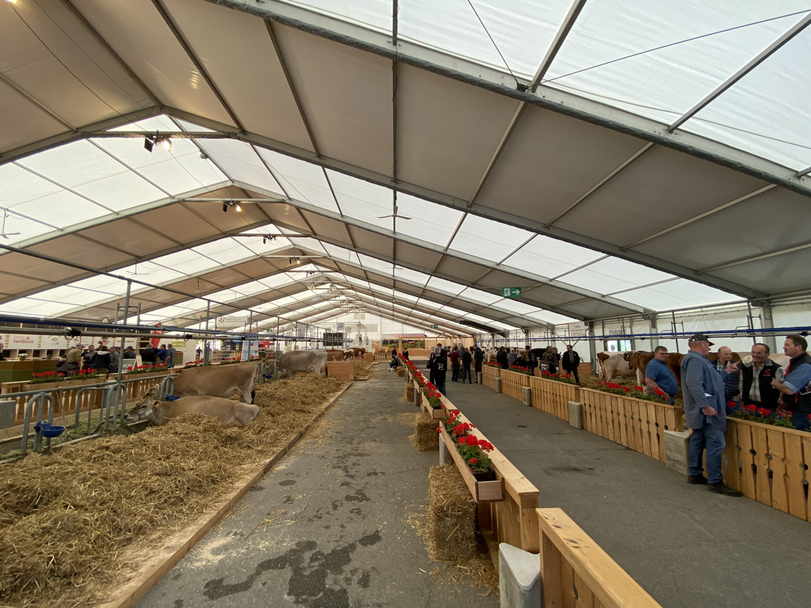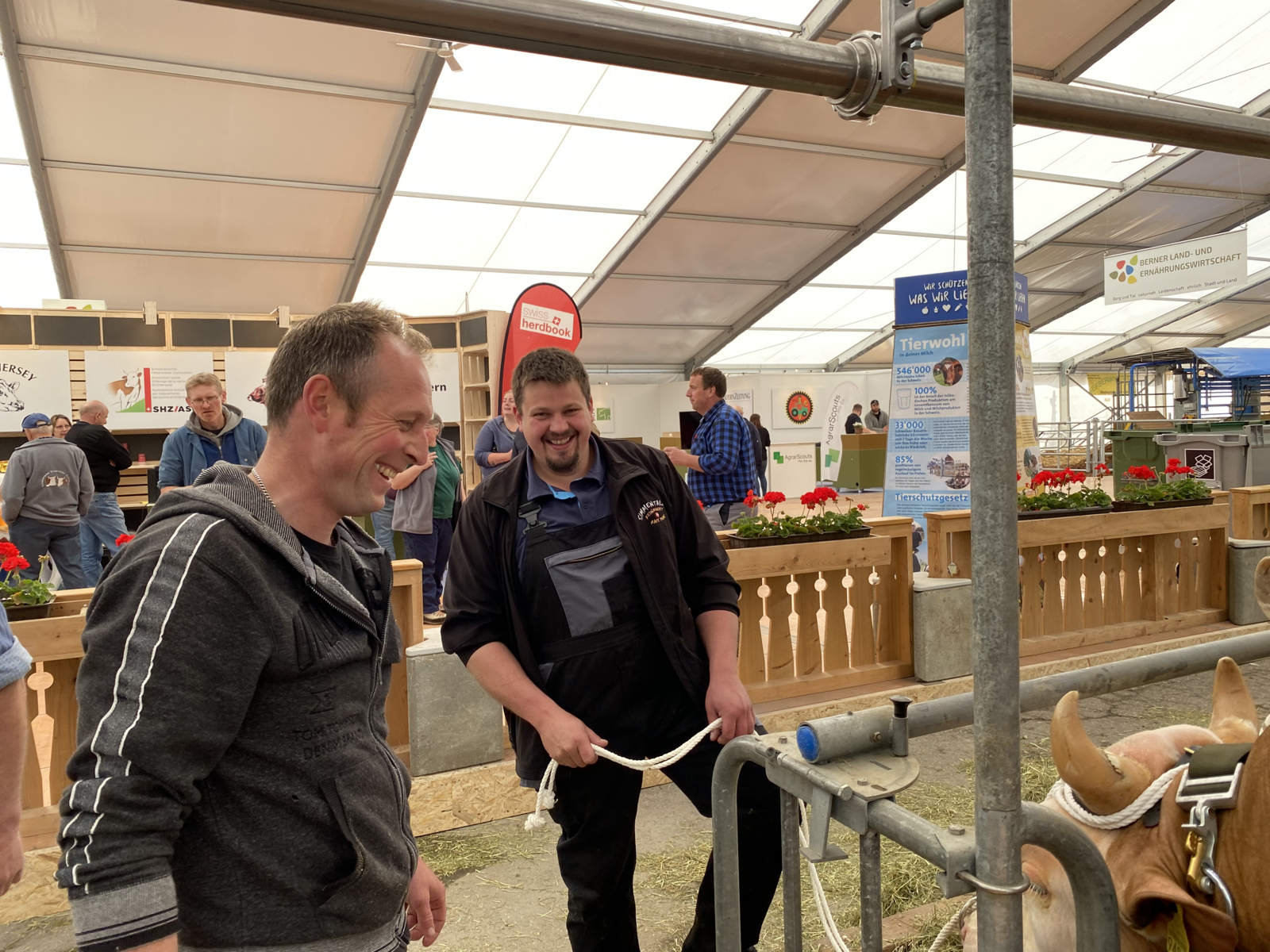 Santos, Martin Liechti und Bernhard Hadorn laufen an den Hallen vorbei. Der Kuhstall mit den Lägern, wo auch der Simmentalerstier die nächsten Tage verbringt, ist ganz hinten. Diverse Fahrzeuge kommen den dreien auf dem schmalen Weg entgegen. An ein Kreuzen ist nicht zu denken, dazu fehlt der Platz. So muss jeweils der Schwächere weichen – natürlich sind es jeweils die Fahrzeuge.