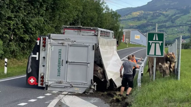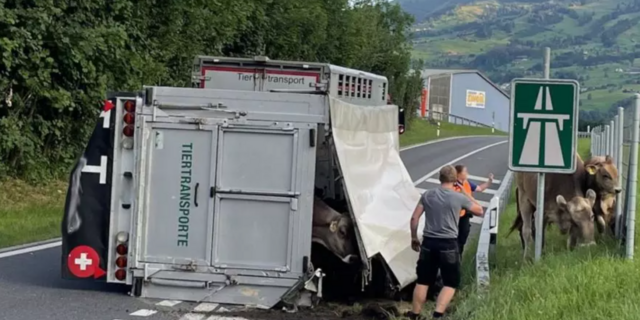 Ein Tiertransporter ist bei einem Selbstunfall auf die Seite gekippt – Strassensperre