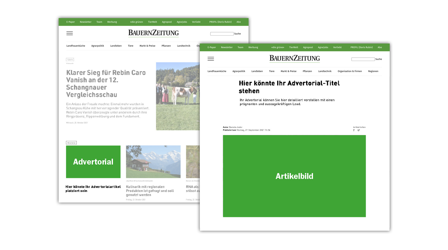 «BauernAgriPool» ist eine Anzeigen-Kombination der landwirtschaftlichen Zeitung BauernZeitung und der Westschweizer Wochenzeitung Agri. Profitieren Sie vom attraktiven Kombirabatte von 11% und erreichen Sie Ihr Zielpublikum in der Deutschschweiz und Romandie gleichermassen.